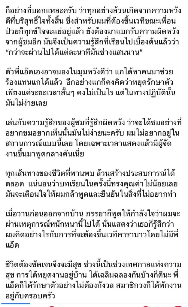 ก็อย่างที่บอกแหละครับ ว่าทุกอย่างล้วนเกิดจากความหวังดีที่บริสุทธิ์ใจทั้งสิ้น ซึ่งสำหรับผมที่ต้องขึ้นเวทีขณะเพื่อนป่วยก็ทุกข์ใจจะแย่อยู่แล้ว ยังต้องมาแบกรับความผิดหวังจากผู้ชมอีก มันจึงเป็นความรู้สึกที่เรียนไปเบื้องต้นแล้วว่า “กว่าจะผ่านไปได้แต่ละนาทีมันช่างแสนนาน”