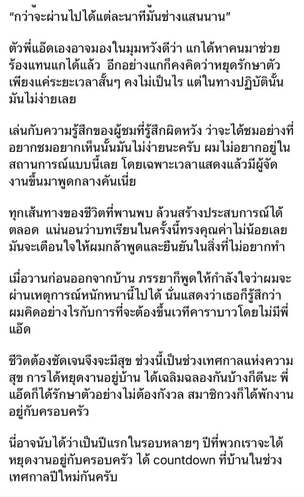 ชีวิตต้องชัดเจนจึงจะมีสุข ช่วงนี้เป็นช่วงเทศกาลแห่งความสุข การได้หยุดงานอยู่บ้าน ได้เฉลิมฉลองกันบ้างก็ดีนะ พี่แอ๊ดก็ได้รักษาตัวอย่างไม่ต้องกังวล สมาชิกวงก็ได้พักงานอยู่กับครอบครัว