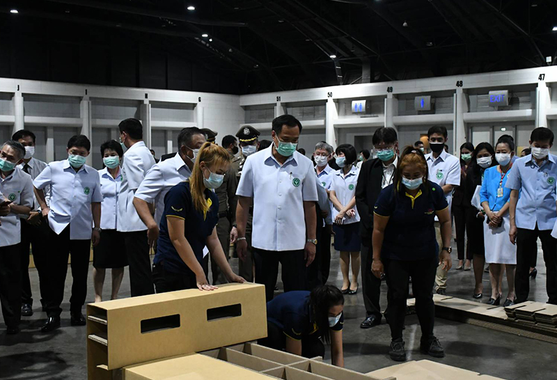 นายอนุทิน ชาญวีรกูล รองนายกรัฐมนตรีและรัฐมนตรีว่าการกระทรวงสาธารณสุข พร้อมด้วย นพ.เกียรติภูมิ วงศ์รจิต ปลัดกระทรวงสาธารณสุข และคณะผู้บริหาร ลงพื้นที่อาคารชาเลนเจอร์ เมืองทองธานี เตรียมจัดตั้ง โรงพยาบาลบุษราคัม พร้อมรับมอบเตียงกระดาษจาก บริษัท ปัญจพล ไฟเบอร์ คอนเทนเนอร์ จำกัด สนับสนุนเพื่อสำหรับใช้ในโรงพยาบาลบุษราคัม เบื้องต้นจำนวน 3,500 เตียง