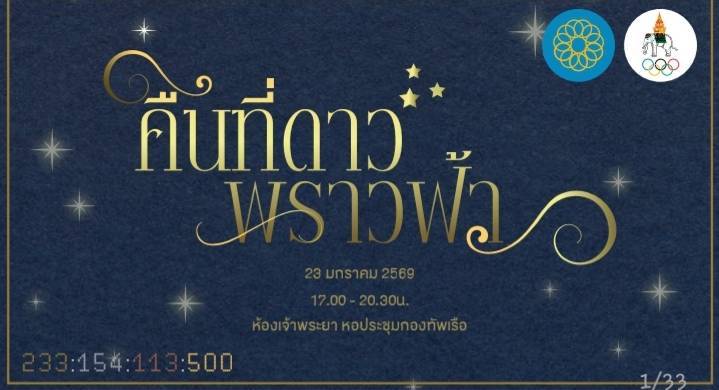ประเทศ นั่นคือ สมเด็จพระนางเจ้า พระบรมราชินี ทรงพระปรีชาสามารถคว้าเหรียญทอง นำทัพกีฬาไทยเปล่งประกายเป็นมิ่งขวัญสืบนานเท่านาน และเป็นคืนที่เต็มไปด้วยแสงระยิบระยับของดวงดาวเต็มท้องฟ้ามารวมกันเปล่งประกายความงดงาม จึงได้มีการจัดงานเลี้ยงและมอบโล่เกียรติคุณ แก่ผู้ที่ร่วมสร้างความสำเร็จในครั้งนี้โดยใช้ชื่องานนี้ว่า “คืนที่ดาวพราวฟ้า” สำหรับวันจัดงานกำหนดขึ้นวันศุกร์ที่ 23 ม.ค พ.ศ. 2569 เวลา 17.00 –20.30 น. ณ ห้องเจ้าพระยา หอประชุมกองทัพเรือ