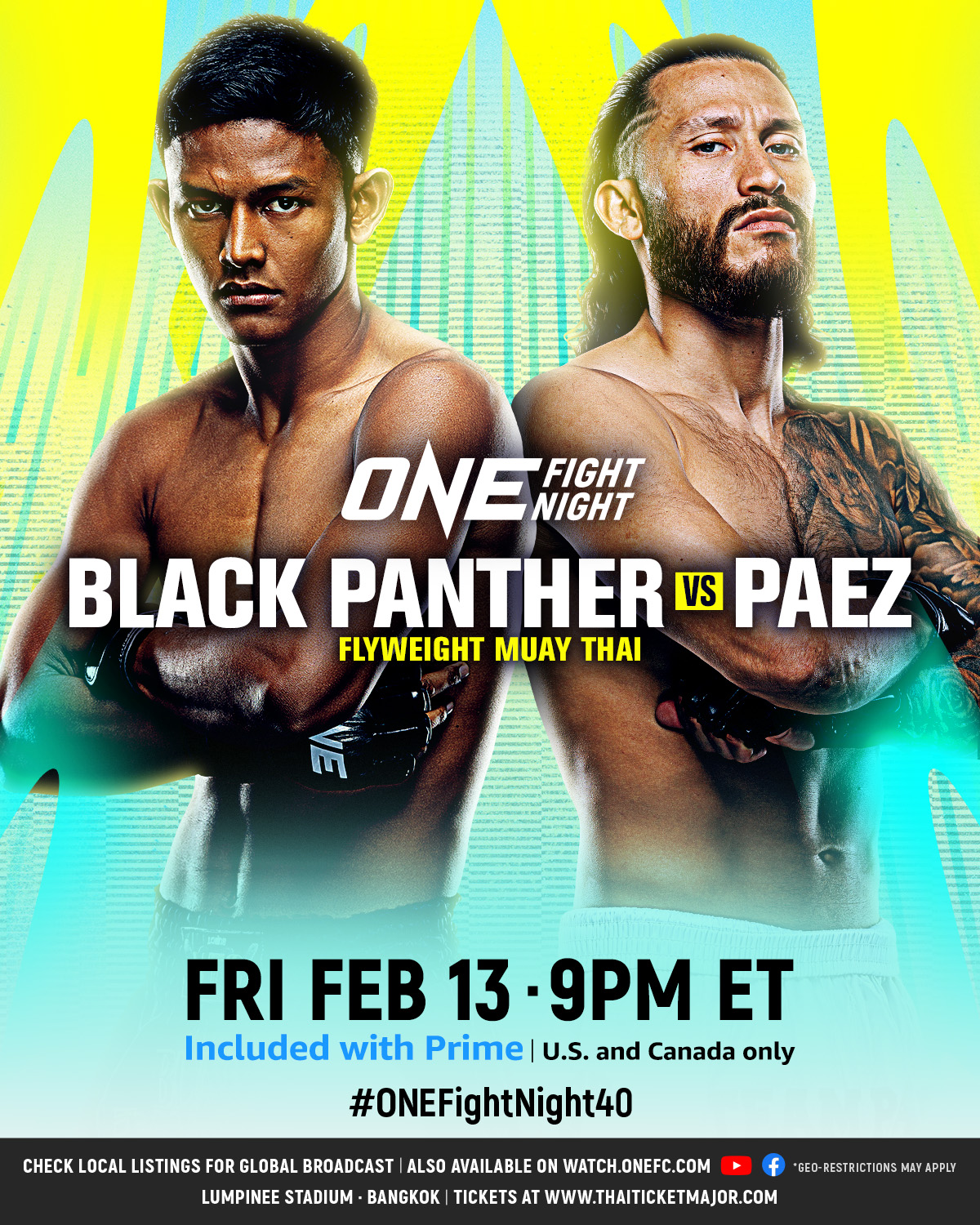 เผยโฉมคู่มวยน่าจับตาในศึก ONE Fight Night 40 ที่จะถ่ายทอดสดจากสนามมวยเวทีลุมพินี (รามอินทรา) ในช่วงไพรม์ไทม์อเมริกา ซึ่งตรงกับช่วงเช้าเวลา 09:00 น. ในวันเสาร์ที่ 14 ก.พ. 69 โดย “แบล็คแพนเธอร์” มวยครบเครื่องจากสงขลา จะโคจรมาปะทะ “ดิเอโก ปาเอซ” จอมบู๊ตัวแทนสหรัฐอเมริกา/โคลอมเบีย ในกติกามวยไทย รุ่นฟลายเวต (125-135 ป.)