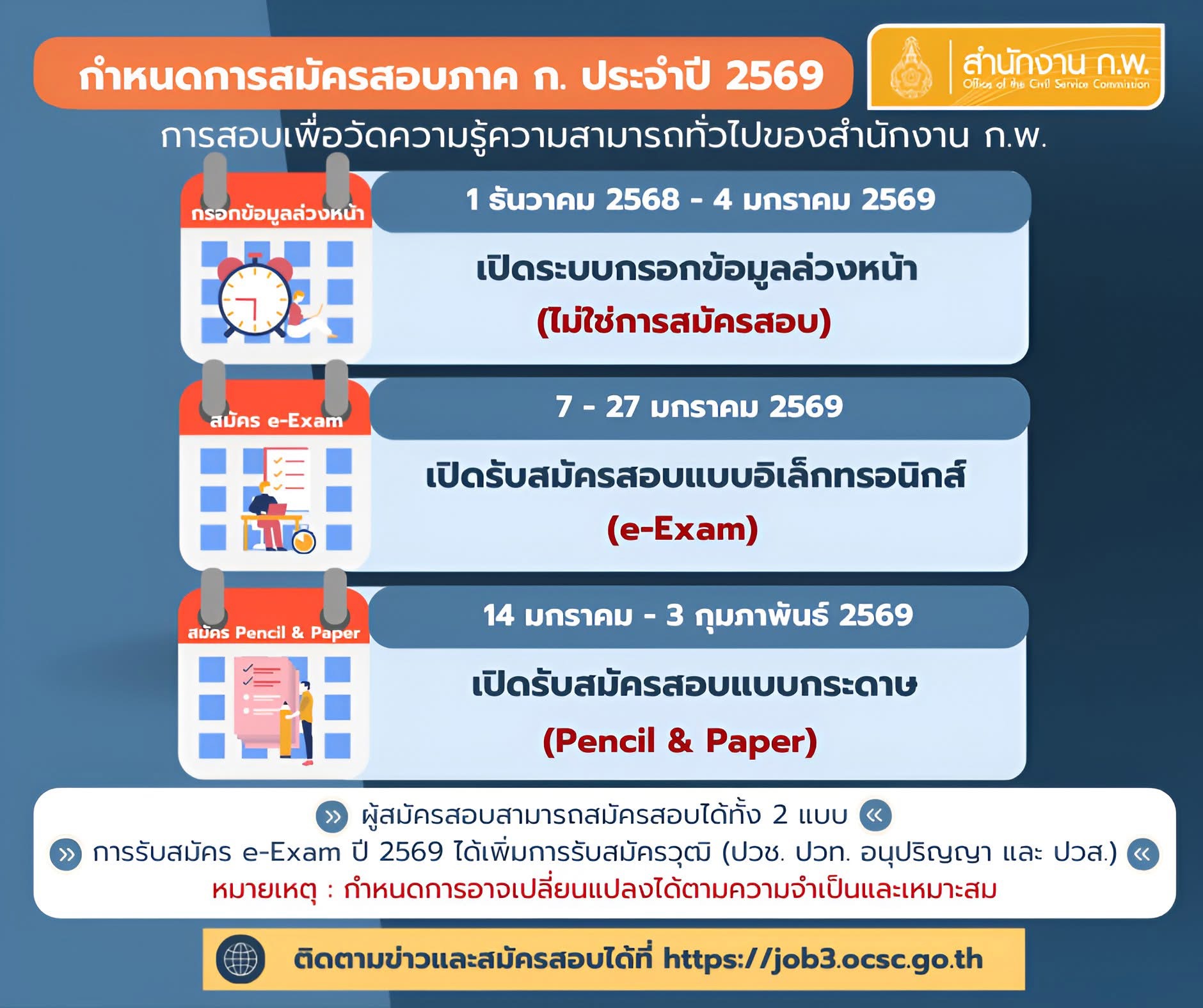 การสมัครสอบ ก.พ. ประจำปี 2569 รับสมัครตั้งแต่วันที่ 7 มกราคม 2569 – 27 มกราคม 2569 แบบอิเล็กทรอนิกส์ ( e- Exam) และ วันที่ 14 มกราคม 2569 – 3 กุมภาพันธ์ 2569 แบบกระดาษ (Pencil & Peper) แนะนำให้สมัครล่วงหน้า เพื่อหลีกเลี่ยงปัญหาระบบขัดข้องในช่วงวันสุดท้ายของการรับสมัคร