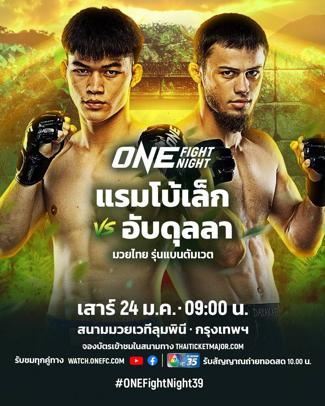 ตามด้วยความมันที่ทุกคนต้องห้ามพลาดในศึก ONE Fight Night 39 ในวันเสาร์ที่ 24 ม.ค.นี้ เริ่มคู่แรกเวลา 09.00 น. โดยคู่เอก “แรมโบ้เล็ก ฉ.อจลบุญ” จอมสาดแข้งจากชัยภูมิ ออกโรงรั้งอันดับ 4 แรงกิง ONE มวยไทย รุ่นแบนตัมเวต (135-145 ป.) จาก “อับดุลลา ดายาคาเอฟ” มวยหมัดจากรัสเซีย เจ้าของแรงกิงอันดับ 5 รุ่นเดียวกัน ในกติกามวยไทย รุ่นแบนตัมเวต