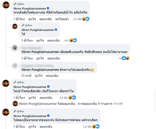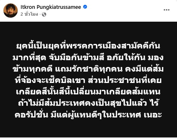 ล่าสุด “จ๋าย” ได้โพสต์ประเด็นละเอียดอ่อนเกี่ยวกับการเมืองว่า “ยุคนี้เป็นยุคที่พรรคการเมืองสามัคคีกันมากที่สุด จับมือกันข้ามสี อภัยให้กัน มองข้ามทุกคดี แถมรักชาติทุกคน คงมีแต่ส้มที่จ้องจะเช็คบิลเขา ส่วนประชาชนที่เคยเกลียดสีนั้นสีนี้เปลี่ยนมาเกลียดส้มแทน ถ้าไม่มีส้มประเทศคงเป็นสุขไปแล้ว ไร้คอรัปชั่น มีแต่ผู้แทนดีๆในประเทศ เนอะ”