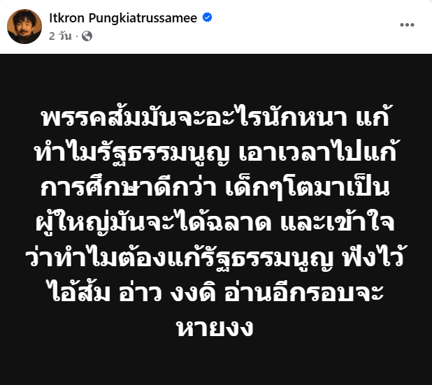 ใกล้เข้ามาทุกที่กับการเลือกตั้งนายกรัฐมนตรีของประเทศไทย ซึ่งทางด้านประชาชนและคนในวงการบันเทิงต่างออกมาแสดงความคิดเห็นต่อการเลือกตั้งครั้งนี้ไม่น้อย ซึ่งก่อนหน้านี้หนุ่ม “จ๋าย ไททศมิตร” หรือ “จ๋าย อิชณน์กร” ได้โพสต์ข้อความถึงพรรคการเมืองหนึ่งว่า “พรรคส้มมันจะอะไรนักหนา แก้ทำไมรัฐธรรมนูญ เอาเวลาไปแก้การศึกษาดีกว่า เด็กๆโตมาเป็นผู้ใหญ่มันจะได้ฉลาด และเข้าใจว่าทำไมต้องแก้รัฐธรรมนูญ ฟังไว้ไอ้ส้ม อ่าว งงดิ อ่านอีกรอบจะหายงง”