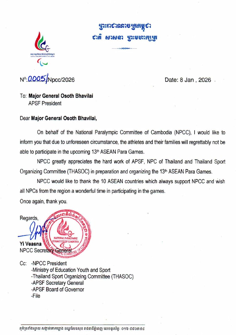 APSF ยืนยันได้รับหนังสือจากคณะกรรมการพาราลิมปิกแห่งชาติกัมพูชา แจ้งถอนตัวจากการแข่งขันกีฬาอาเซียนพาราเกมส์ ครั้งที่ 13 ที่จังหวัดนครราชสีมา ระหว่างวันที่ 20–26 มกราคม 2569 พร้อมย้ำการแข่งขันยังคงจัดขึ้นตามกำหนดเดิม