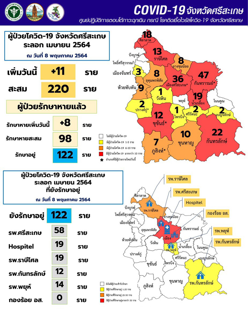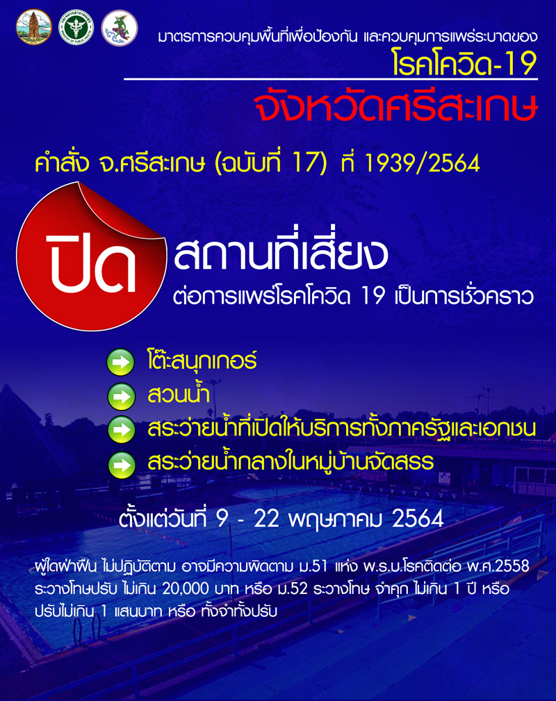 นายวัฒนา พุฒชาติ ผวจ.ศรีสะเกษ กล่าวว่า ตนได้ลงนามในประกาศคำสั่งจังหวัดศรีสะเกษ ที่ 1940/2564 ลงวันที่ 8 พ.ค. 2564 เกี่ยวกับมาตรการควบคุมพื้นที่และการปิดสถานที่เสี่ยงต่อการแพร่ระบาดของโรคติดเชื้อโควิด-19 ระลอกใหม่ หลังเกิดกลุ่มคลัสเตอร์เกิดขึ้นหลายกลุ่มกระจายไปในหลายพื้นที่อย่างรวดเร็ว และมีจำนวนผู้ติดเชื้อสะสมและผู้ติดเชื้อรายใหม่ ซึ่งการติดเชื้อได้เพิ่มจำนวนขึ้นอย่างต่อเนื่อง โดยเฉพาะในพื้นที่ อ.กันทรารมย์ ซึ่งเป็นอำเภอที่พบผู้ติดเชื้อมากสุดเป็นอันดับ 1 ของ จ.ศรีสะเกษ คลัสเตอร์ที่ 5 นี้ มีผู้ติดเชื้อมากถึง 20 รายแล้ว และมีผู้สัมผัสเสี่ยงสูงจำนวนหลายราย