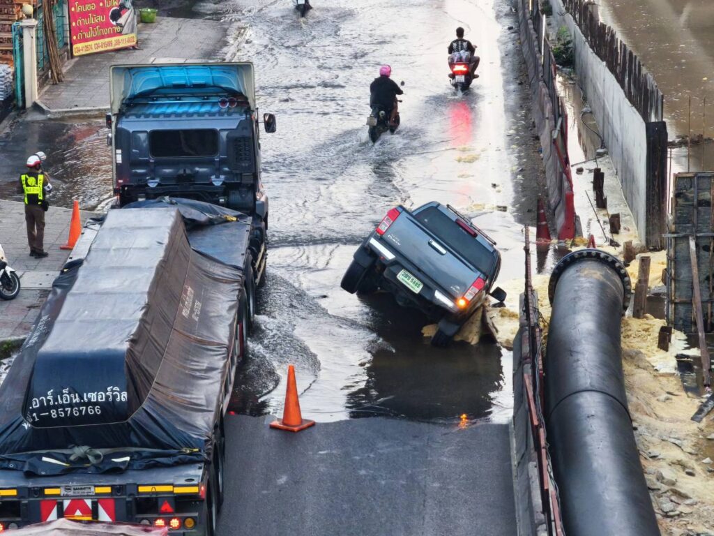 รถกระบะตกหลุมยุบถนนพระราม 2 ทับท่อประปาแตกน้ำท่วมถนน