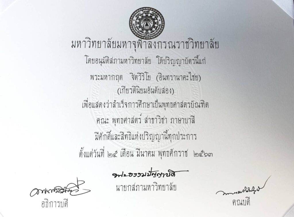ครูบาโต เข้ารับปริญญาบัตร เกียรตินิยมอันดับ 2 สาขาวิชา ภาษาบาลี ที่ มจร.