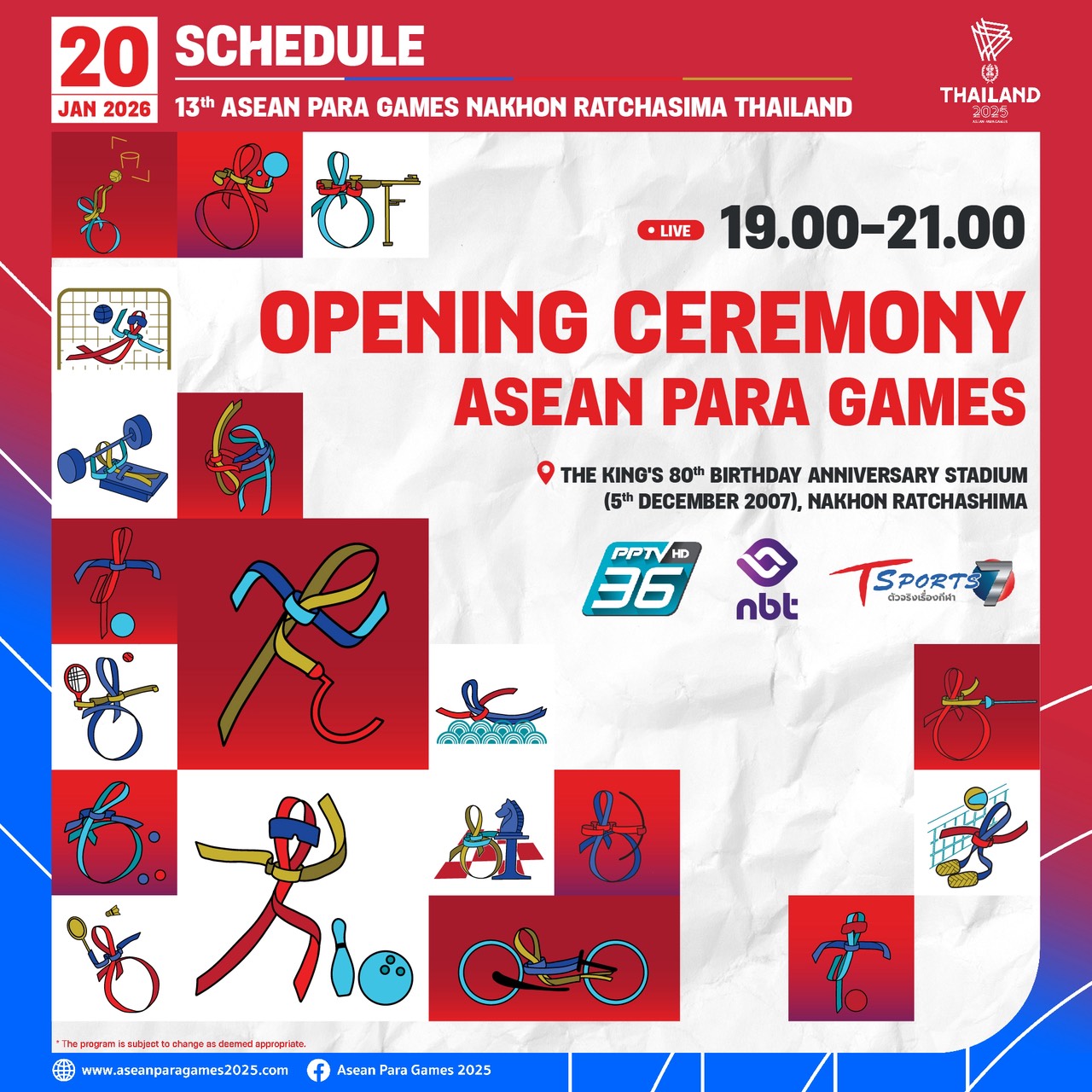 เปิดฉากมหกรรมกีฬาคนพิการระดับภูมิภาคอย่างยิ่งใหญ่ กับ พิธีเปิดการแข่งขันกีฬาอาเซียนพาราเกมส์ ครั้งที่ 13 (13th ASEAN Para Games) ซึ่งจะมีขึ้นในวันที่ 20 มกราคม 2569 เวลา 19.00 น. เป็นต้นไป ณ สนามกีฬาเฉลิมพระเกียรติ 80 พรรษา 5 ธันวาคม 2550 จังหวัดนครราชสีมา ขอเชิญชวนพี่น้องประชาชนร่วมรับชมและส่งแรงใจเชียร์นักกีฬาพาราจากทั่วอาเซียนในช่วงเวลาประวัติศาสตร์ครั้งสำคัญ