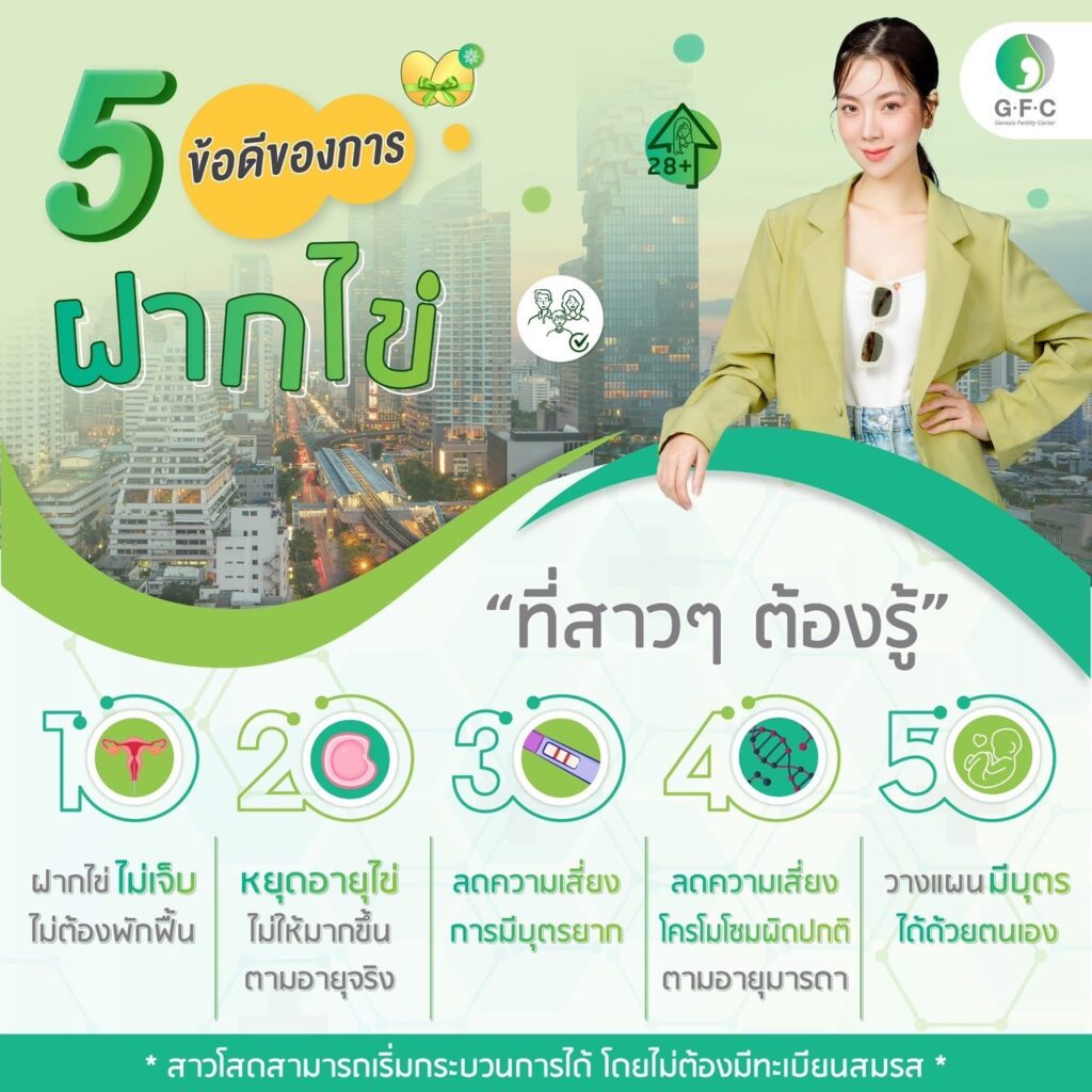 สำหรับในยุคใหม่หรือคุณผู้หญิงหลายคนที่วางแผนแต่ยังไม่ต้องการตั้งครรภ์หรืออาจจะด้วยเหตุผลอื่นๆ ที่ทำให้ไม่สามารถตั้งครรภ์ได้ในช่วงเวลาที่กำลังมาถึงเร็วๆนี้ “ฝากไข่” คือ เทรนด์ใหม่ยอดฮิตของหมู่สาวสาว จากทั่วทุกมุมโลกที่กำลังให้ความสนใจกันอย่างแพร่หลาย ด้วยชีวิตโสดที่อิสระของสาวโสดยุคใหม่ช่างหอมหวาน ทำให้สาวๆติดใจการใช้ชีวิตโสด และเลื่อนระยะเวลาการสร้างครอบครัวออกไป แต่แน่นอนว่าถ้าคุณเป็นสาวสวยเก่งก็ต้องไม่ลืมที่จะวางแผนไว้สำหรับการมีเจ้าตัวน้อยในอนาคตเอาไว้ด้วย การฝากไข่เป็นวิธีที่ช่วยให้คุณผู้หญิงหลายคนสามารถวางแผนการตั้งครรภ์ในอนาคตที่สะดวกหรือต้องการได้ เพื่อให้สาวๆมีความรู้และความเข้าใจเกี่ยวกับการฝากไข่มากขึ้น GFC (Genesis Fertility Center) คลินิกบริการทางการแพทย์ สำหรับผู้เตรียมพร้อมก่อนการมีบุตรตลอดจนรักษาภาวะมีบุตรยาก เรามีแพทย์เฉพาะทางพร้อมให้คำปรึกษา “เราพร้อมดูแลและให้คำปรึกษาด้านสุขภาพผู้หญิง การฝากไข่ ตลอดจนรักษาภาวะมีบุตรยาก GFC เคียงข้างทุกก้าวของการมีบุตร“