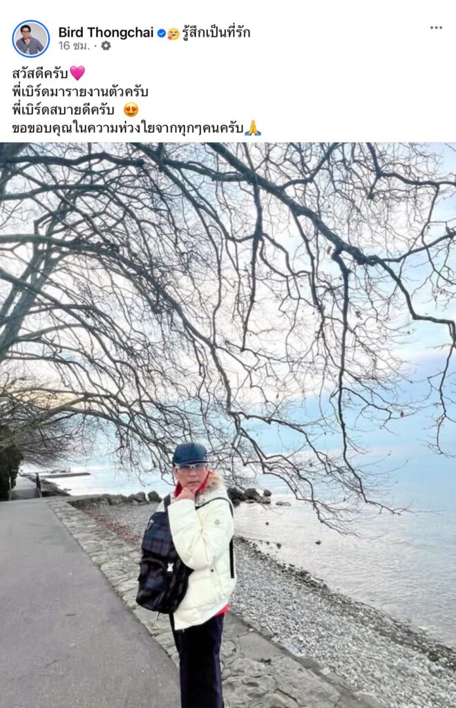 ล่าสุดเรียกว่า “เบิร์ด” ไม่ปล่อยให้แฟนเป็นห่วงนาน รีบออกมาโพสต์ภาพขณะไปเที่ยว พร้อมชี้แจงว่า “สวัสดีครับ💗 พี่เบิร์ดมารายงานตัวครับ พี่เบิร์ดสบายดีครับ 😍 ขอขอบคุณในความห่วงใยจากทุกๆคนครับ 🙏”
