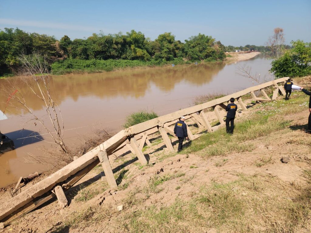 อุปกรณ์ไม่ครบตามแบบ: ตรวจสอบพื้นที่พบการติดตั้ง “สเตย์” ยึดเสาเข็มเพียง 4 จุด จากที่กำหนดไว้ 11 จุด ทำให้โครงสร้างขาดแรงยึดเหนี่ยวเมื่อเจอน้ำกัดเซาะ ผู้รับจ้าง อ้าง “อุทกภัย” ทำพัง