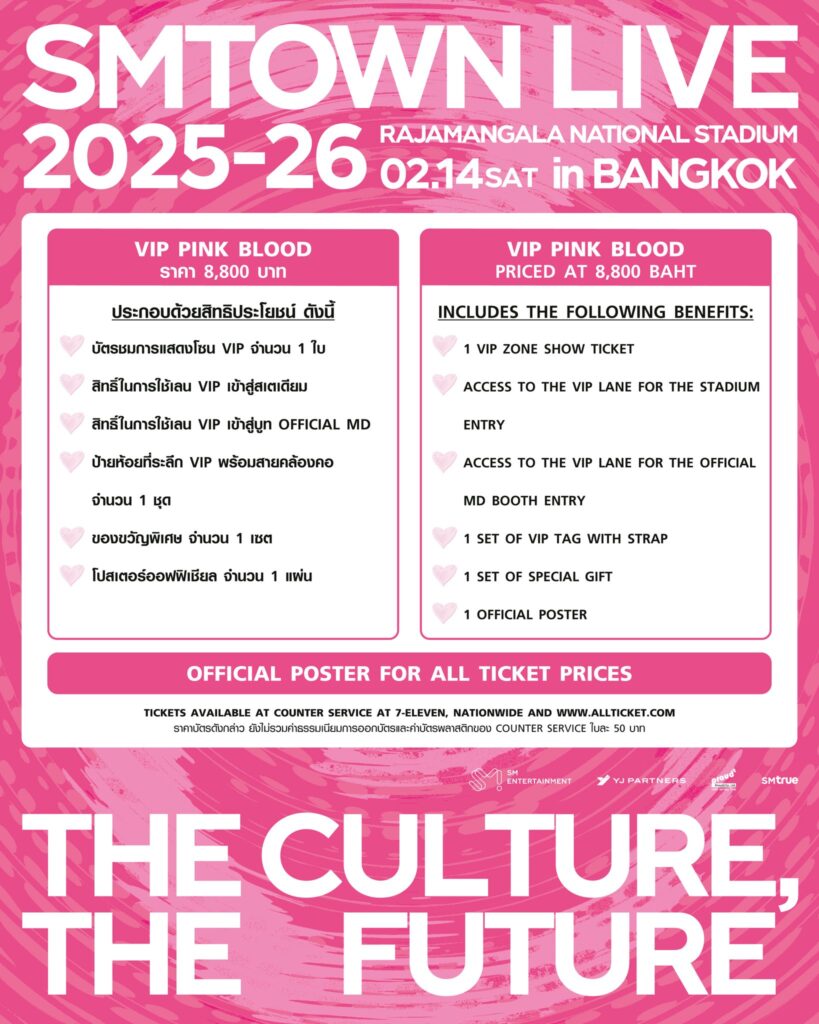 ณ คอนเสิร์ตปิดท้ายทัวร์ที่ประเทศไทย ‘SMTOWN LIVE 2025-26 [THE CULTURE, THE FUTURE] in BANGKOK’ เลือดสีชมพูที่หล่อเลี้ยงหัวใจของ PINK BLOOD (พิงค์บลัด) มาอย่างยาวนานจะสูบฉีดยิ่งกว่าครั้งไหน ด้วยพลังแห่งดนตรีและศิลปิน SM ที่ทุกคนรัก มาร่วมเป็นส่วนหนึ่งในการพิสูจน์ความยิ่งใหญ่ อลังการ และน่าตื่นตาตื่นใจที่สุดแห่งปี ซื้อบัตรได้แล้ววันนี้ ทางเคาน์เตอร์เซอร์วิสในร้าน 7-Eleven ทุกสาขาทั่วประเทศ และทางเว็บไซต์