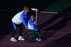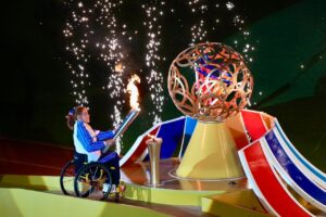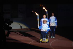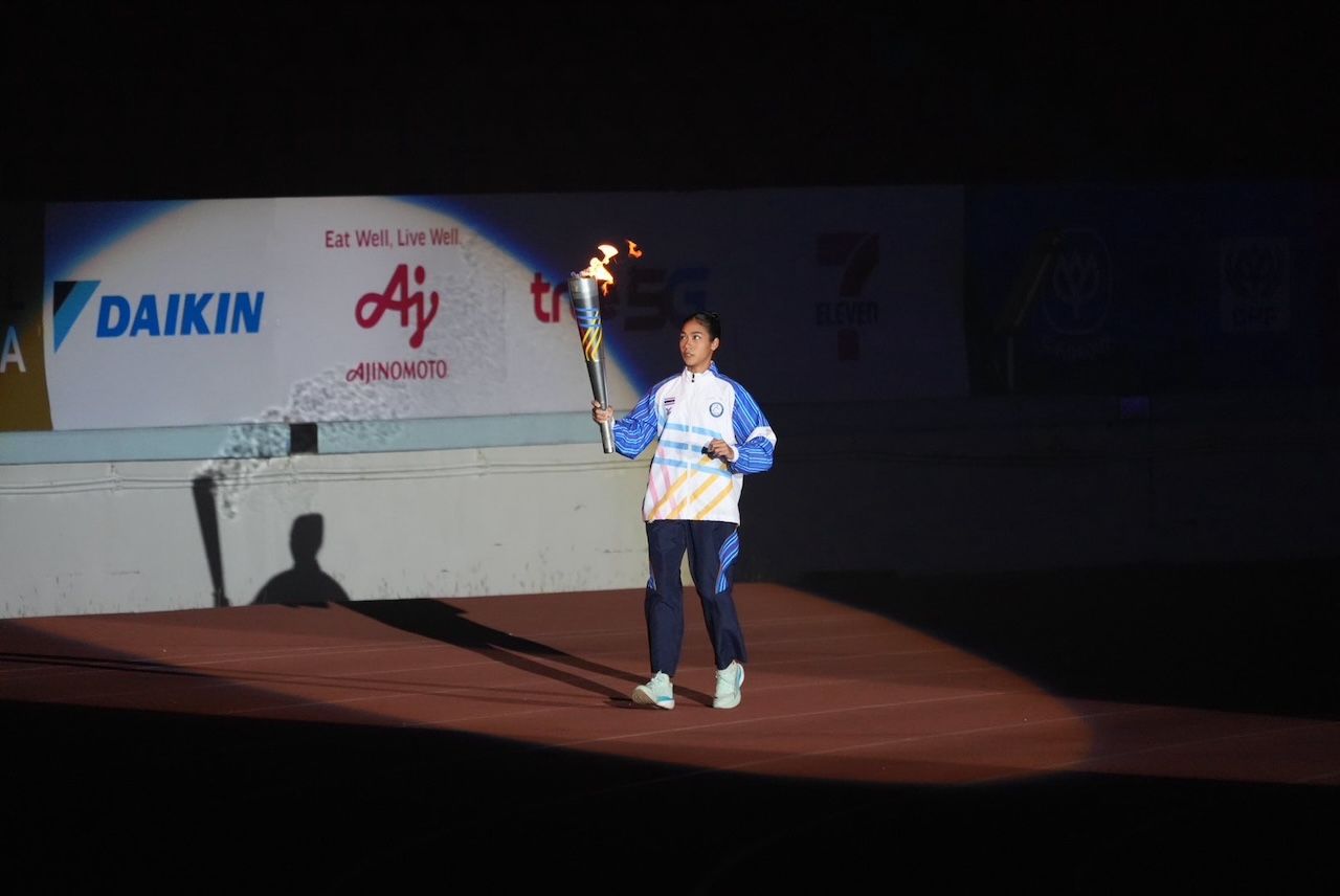 ขณะที่พิธีวิ่งคบเพลิง เริ่มต้นโดย “บีม” ชัยวัฒน์ รัตนะ, พนม ลักษณะพริ้ม และ “ลูกเกด” อรวรรณ ไกรสิงห์ ก่อนส่งต่อให้ “แวว” สายสุนีย์ จ๊ะนะ นักกีฬาวีลแชร์ฟันดาบ เจ้าของ 5 เหรียญทองพาราลิมปิกเกมส์ ทำหน้าที่เป็นผู้วิ่งคบเพลิงคนสุดท้าย และจุดไฟในกระถาง ประกาศเปิดการแข่งขันอย่างเป็นทางการ