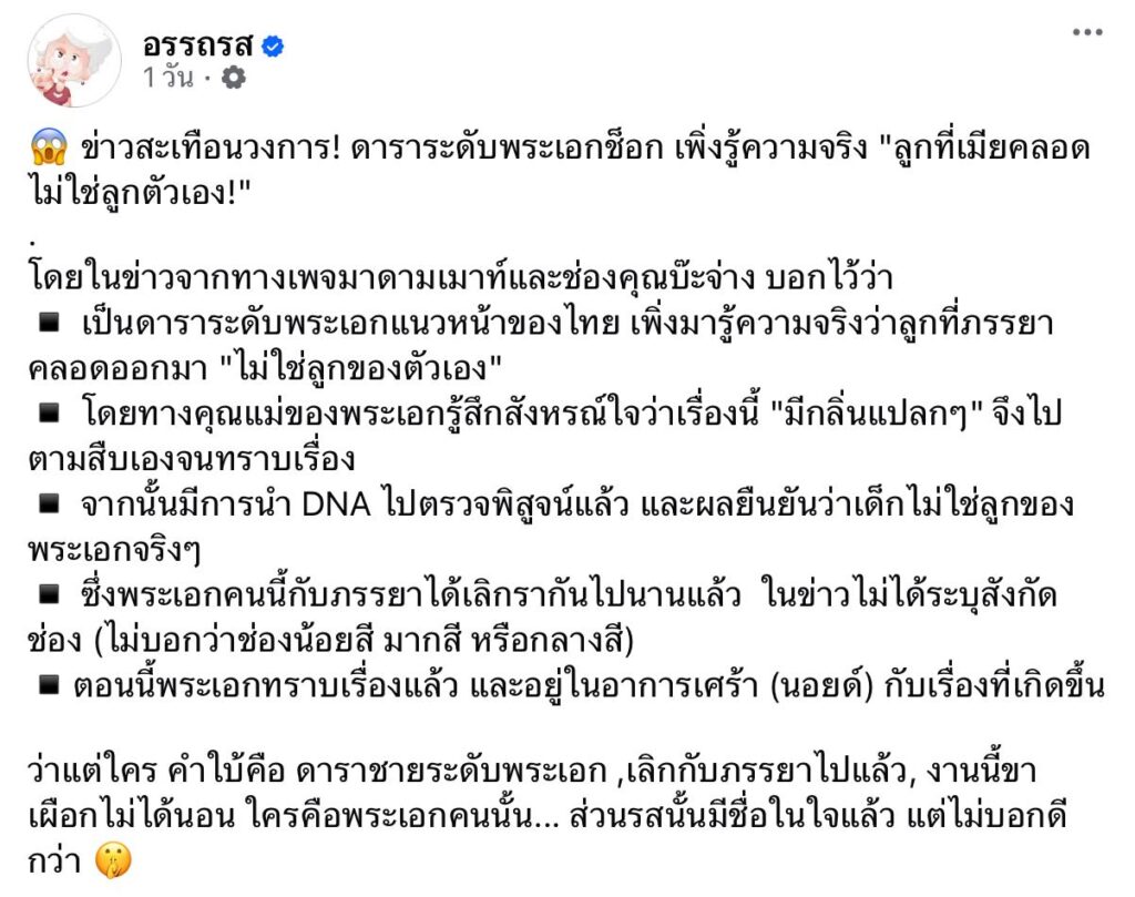 ต่อมาทางเพจ “อรรถรส” ได้ออกมาขยี้ข่าวโดยโพสต์ภาพพร้อมแคปชั่นว่า “ 😱 ข่าวสะเทือนวงการ! ดาราระดับพระเอกช็อก เพิ่งรู้ความจริง “ลูกที่เมียคลอดไม่ใช่ลูกตัวเอง!” . โดยในข่าวจากทางเพจมาดามเมาท์และช่องคุณบ๊ะจ่าง บอกไว้ว่า ▪️ เป็นดาราระดับพระเอกแนวหน้าของไทย เพิ่งมารู้ความจริงว่าลูกที่ภรรยาคลอดออกมา “ไม่ใช่ลูกของตัวเอง” ▪️ โดยทางคุณแม่ของพระเอกรู้สึกสังหรณ์ใจว่าเรื่องนี้ “มีกลิ่นแปลกๆ” จึงไปตามสืบเองจนทราบเรื่อง ▪️ จากนั้นมีการนำ DNA ไปตรวจพิสูจน์แล้ว และผลยืนยันว่าเด็กไม่ใช่ลูกของพระเอกจริงๆ ▪️ ซึ่งพระเอกคนนี้กับภรรยาได้เลิกรากันไปนานแล้ว ในข่าวไม่ได้ระบุสังกัดช่อง (ไม่บอกว่าช่องน้อยสี มากสี หรือกลางสี) ▪️ตอนนี้พระเอกทราบเรื่องแล้ว และอยู่ในอาการเศร้า (นอยด์) กับเรื่องที่เกิดขึ้น ว่าแต่ใคร คำใบ้คือ ดาราชายระดับพระเอก ,เลิกกับภรรยาไปแล้ว, งานนี้ขาเผือกไม่ได้นอน ใครคือพระเอกคนนั้น… ส่วนรสนั้นมีชื่อในใจแล้ว แต่ไม่บอกดีกว่า 🤫” ท่านกลางชาวเน็ตเข้ามาคอมเมนต์อักษรย่อแล้วหวยไปตกที่ “พอร์ช ศรัณย์”
