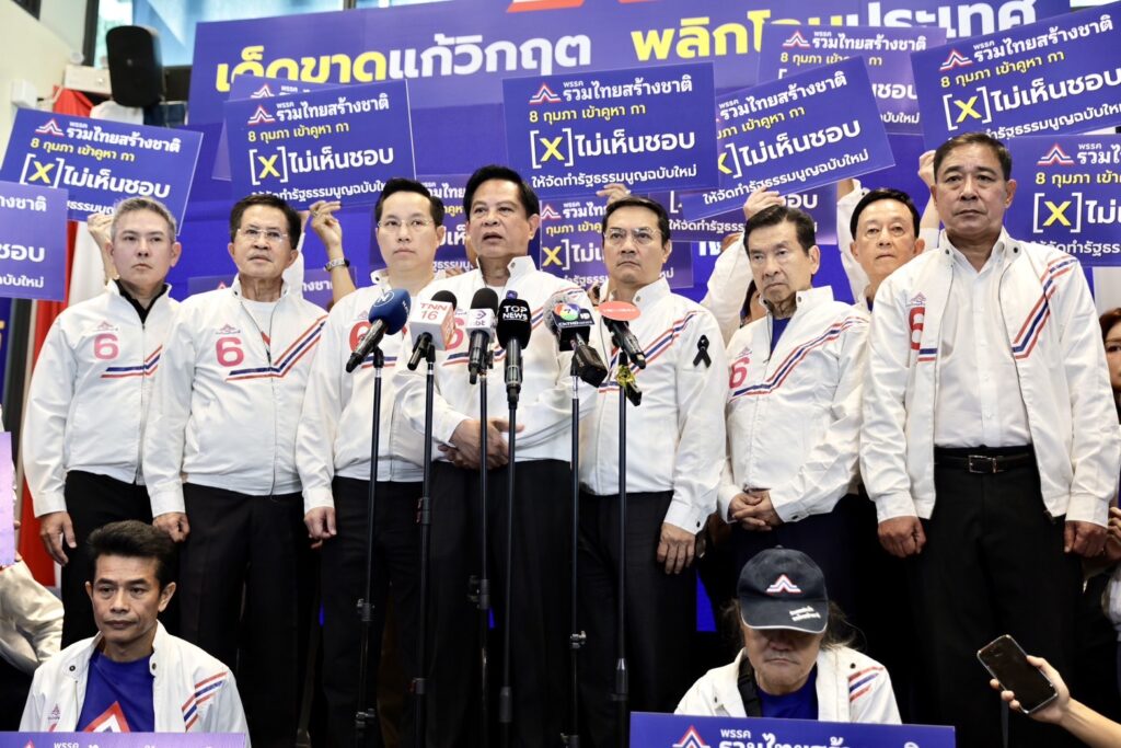นายพีระพันธุ์ สาลีรัฐวิภาค หัวหน้าพรรครวมไทยสร้างชาติ พร้อมด้วยนายชัชวาลล์ คงอุดม เลขาธิการพรรค นายวิทยา แก้วภราดัย นายอรรถวิชช์ สุวรรณภักดี นายนราพัฒน์ แก้วทอง