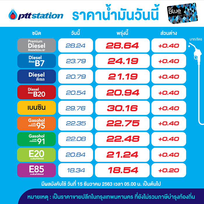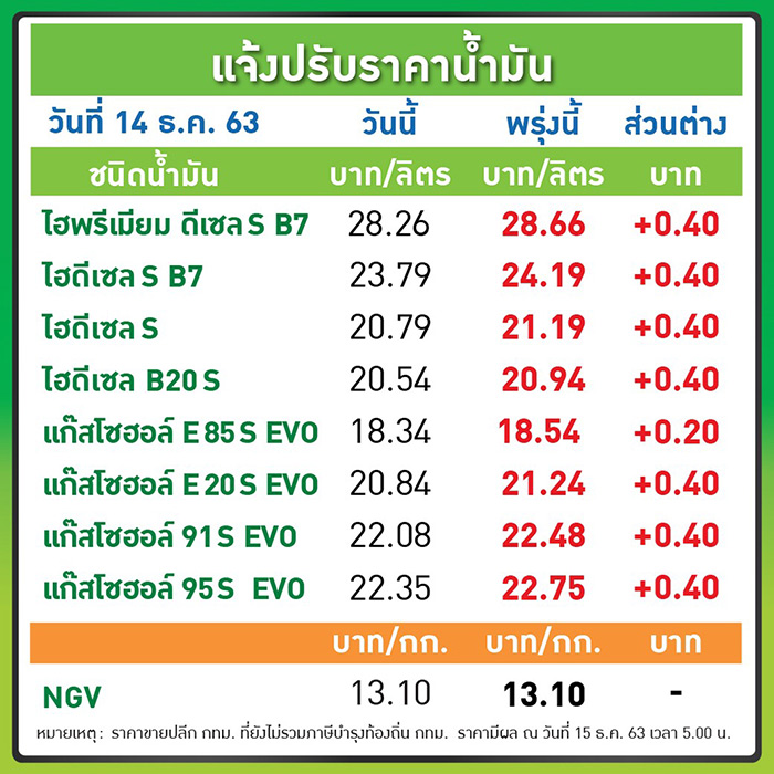 บมจ.ปตท.น้ำมันและการค้าปลีก (OR) ในกลุ่ม บมจ.ปตท. (PTT) และ บมจ.บางจาก คอร์ปอเรชั่น (BCP) ประกาศปรับขึ้นราคาขายปลีกน้ำมันทุกชนิด 40 สต. เว้น E85 ขยับ 20 สต. มีผลพรุ่งนี้ (15 ธ.ค. 2563) เวลา 05.00 น. เป็นต้นไป