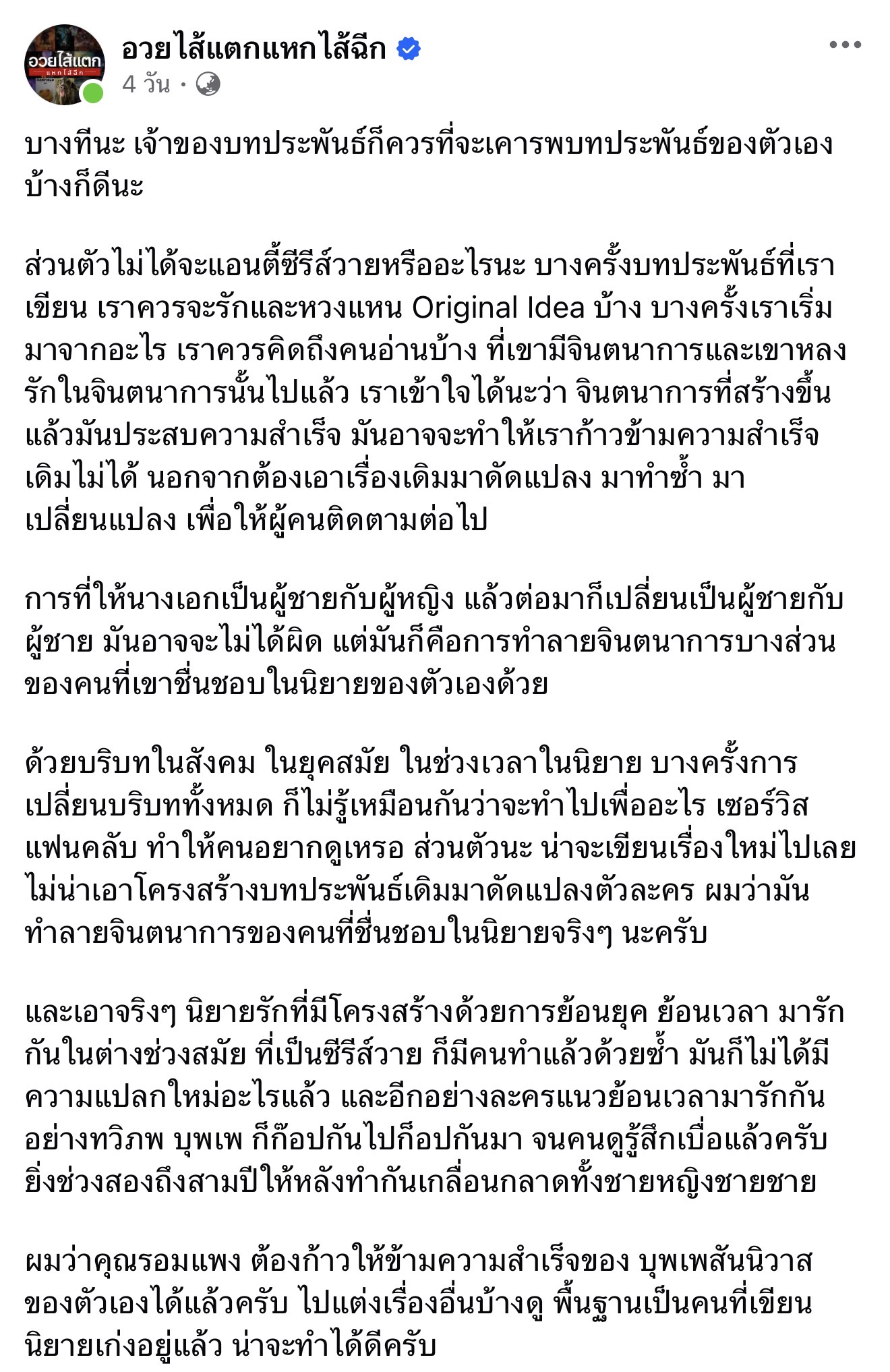 ล่าสุดทางด้านเพจ “อวยไส้แตกแหกไส้ฉีก”ได้ออกมาแสดงความคิดเห็นถึงเรื่องนี้ว่า “บางทีนะ เจ้าของบทประพันธ์ก็ควรที่จะเคารพบทประพันธ์ของตัวเองบ้างก็ดีนะ
