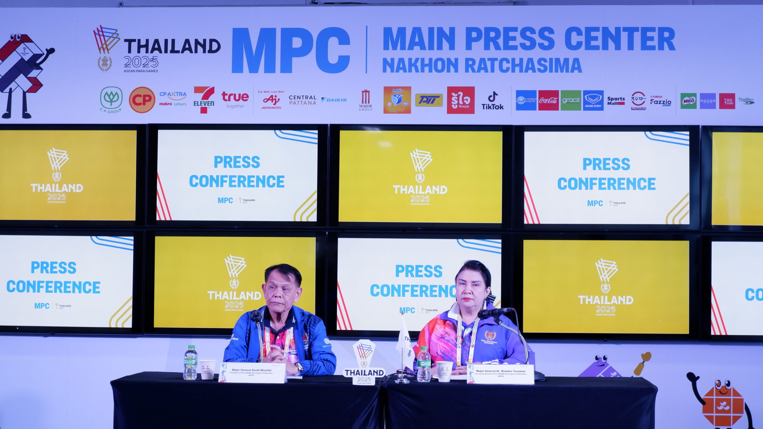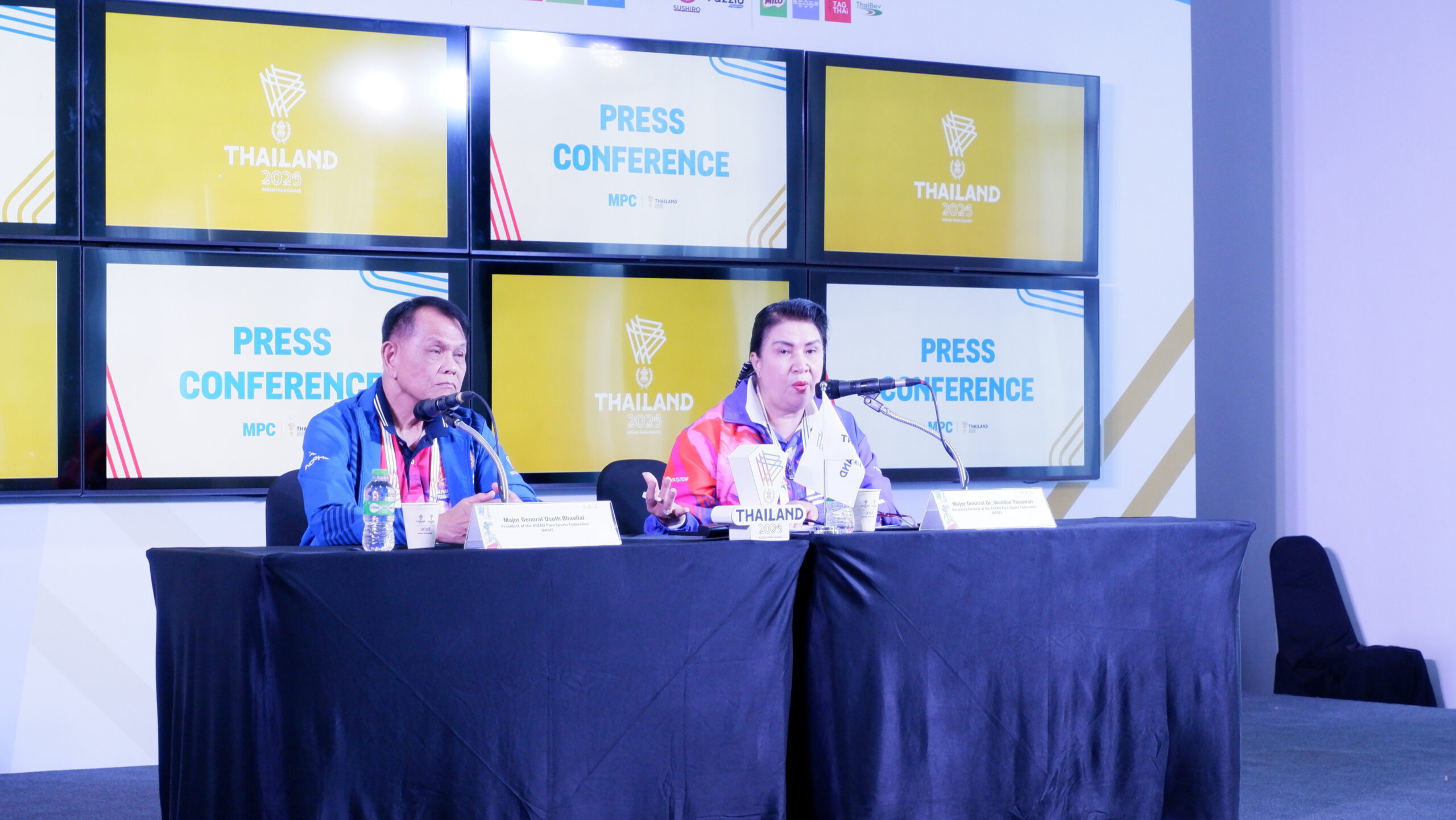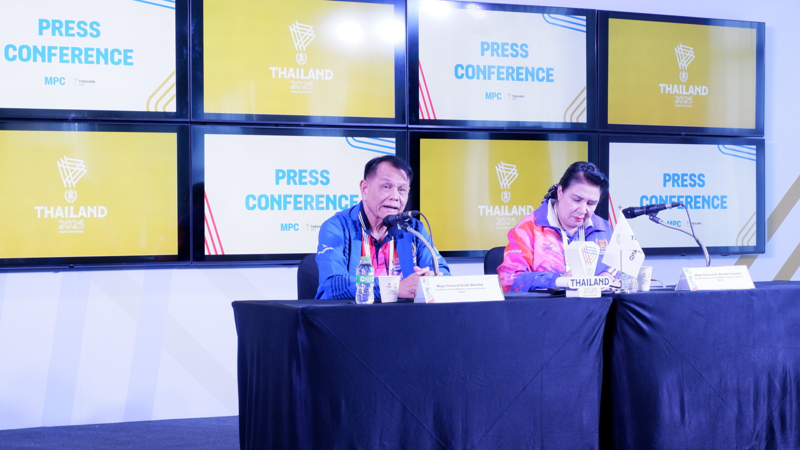 พลตรีโอสถ ภาวิไล ประธานสหพันธ์กีฬาคนพิการแห่งอาเซียน เป็นประธานในการแถลงข่าว พร้อมด้วย พลตรีหญิง ดร.วันดี โตสุวรรณ เลขาธิการสหพันธ์กีฬาคนพิการแห่งอาเซียน ณ ศูนย์ประสานงานสื่อมวลชน (MPC) การแข่งขันกีฬาอาเซียนพาราเกมส์ ครั้งที่ 13 อาคารศูนย์ประชุม สมาคมกีฬาคนพิการแห่งประเทศไทยในพระบรมราชูปถัมภ์ จังหวัดนครราชสีมา เมื่อวันที่ 25 มกราคม 2569