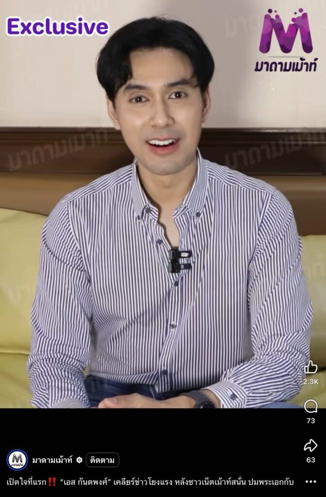 ล่าสุดเจ้าตัวออกมาเปิดใจให้สัมภาษณ์เป็นครั้งแรก ผ่านเพจ “มาดามเม้าท์” เพื่อชี้แจงทุกข้อสงสัยที่กำลังถูกพูดถึงอยู่ในขณะนี้ โดย “เอส” ได้เผยว่า “ผมไม่เล่นโซเชียล” รู้เรื่องนี้มากจากผู้ใหญ่จึงไม่ทราบข่าวนี้มาก่อน พร้อมมองว่าข่าวลือในโลกออนไลน์เป็นเรื่องที่เกิดขึ้นได้เสมอ“บางครั้งข่าวก็มีถูกมีผิด ผมไม่ได้โกรธหรือโทษใคร แต่มันคือธรรมชาติของโซเชียล แต่กลัวมากที่สุดไม่ใช่ตัวกระเเสข่าว แต่เป็นความรู้สึกของคนในครอบครัว