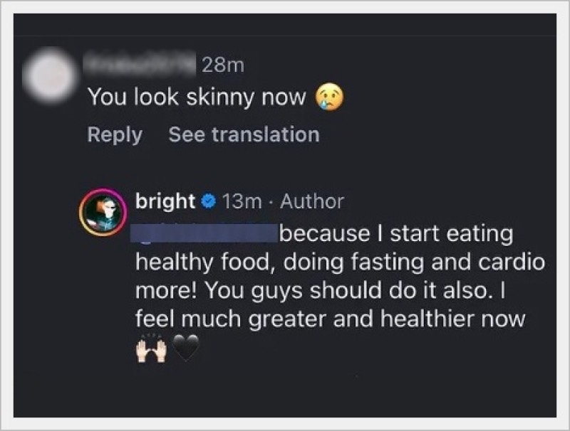 ต่อมาทางด้าน ”ไบร์ท“ ได้ออกมาตอบกลับชาวเน็ตที่เข้ามาคอมเมนต์ว่า “You look skinny now“ ซี่ง ”ไบร์ท“ ตอบว่า ”because I start eating healthy food, doing fasting and cardio more! You guys should do it also. I feel much greater and healthier now“