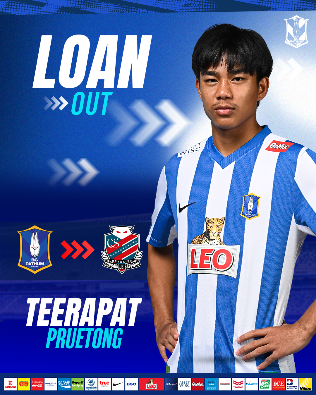 BG Pathum United confirms the loan transfer of 18-year-old Thailand Under-23 international Teerapat Pruetong to J2 League club Hokkaido Consadole Sapporo.