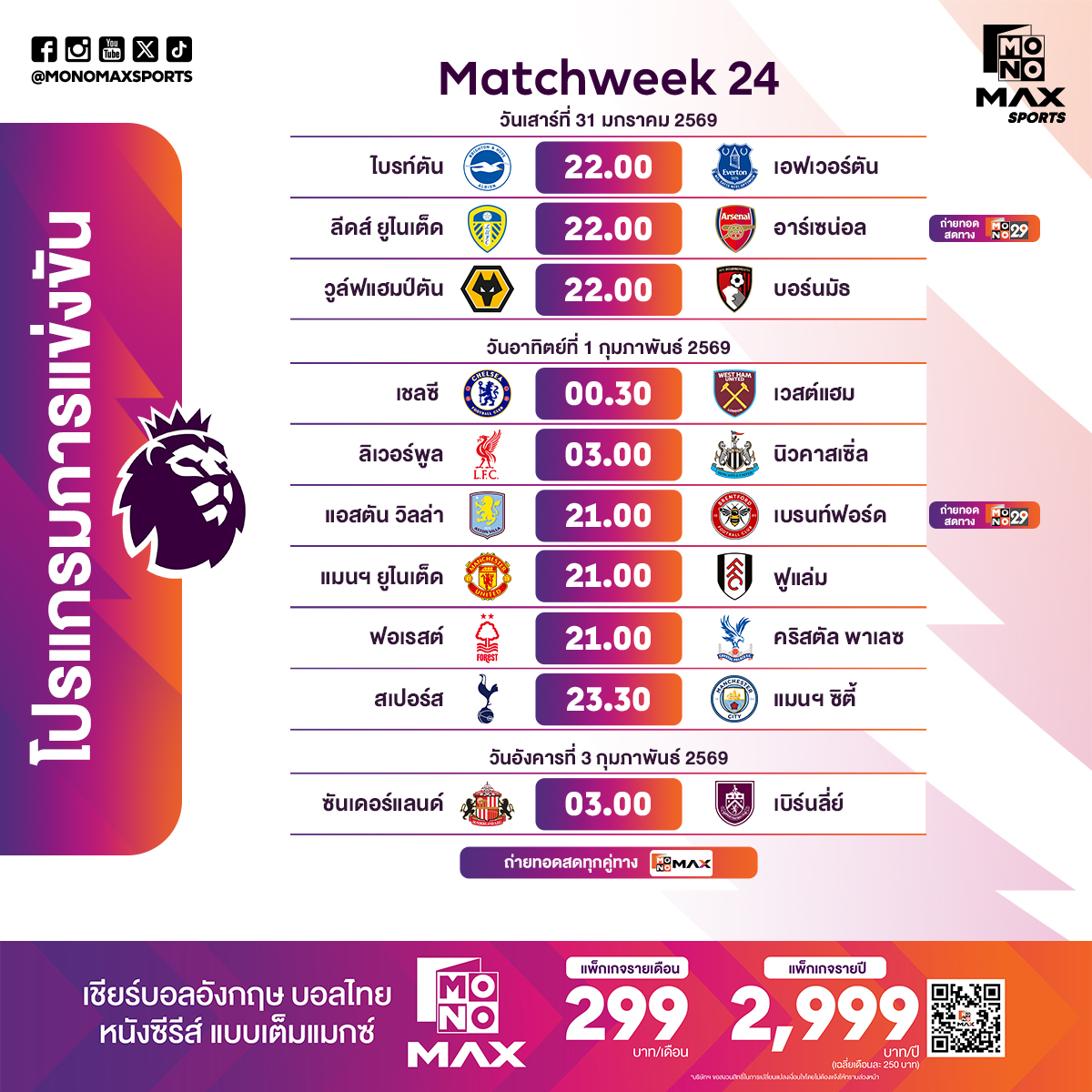 ประเดิมความมันส์พร้อมกันสามคู่ในช่วงค่ำคืน วันเสาร์ที่ 31 มกราคม 2569 เวลา 22.00 น. Monomax ถ่ายทอดสดเริ่มจาก ไบรท์ตัน แอนด์ โฮฟ อัลเบี้ยน ทีมจากกลุ่มกลางตาราง เปิดบ้านรับมือ เอฟเวอร์ตัน ที่ยังต้องการแต้มเพื่อสร้างความมั่นใจและขยับสถานการณ์บนตาราง ต่อเนื่องด้วยเกมที่ถูกจับตามองอย่าง ลีดส์ ยูไนเต็ด เปิดรังดวล อาร์เซนอล ทีมระดับหัวตาราง ซึ่งต้องการรักษาความต่อเนื่องในการลุ้นแชมป์ โดยคู่นี้ถ่ายทอดสดทั้ง Monomax และ ช่อง MONO29 ขณะที่อีกสนาม วูล์ฟแฮมป์ตัน วันเดอเรอร์ส พบ บอร์นมัธ เป็นศึกของสองทีมที่ต้องการชัยชนะเพื่อสร้างความมั่นใจในช่วงครึ่งหลังของฤดูกาล ต่อเนื่อง เวลา 00.30 น. วันอาทิตย์ที่ 1 กุมภาพันธ์ 2569 (คืนวันเสาร์ที่ 31 มกราคม 2569) กับศึกลอนดอนดาร์บี้ระหว่าง เชลซี พบ เวสต์แฮม ยูไนเต็ด ที่ทั้งสองฝ่ายต่างไม่มีพื้นที่ให้ความผิดพลาด และ เวลา 03.00 น. ลิเวอร์พูล จะเปิดแอนฟิลด์รับมือ นิวคาสเซิล ยูไนเต็ด เกมรุกปะทะเกมรุกที่ถูกยกให้เป็นหนึ่งในไฮไลต์ของสัปดาห์ รับชมทาง Monomax