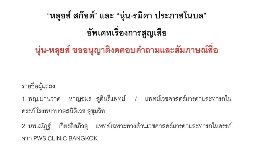 ล่าสุดนับเป็นข่าวเศร้าแห่งการสูญเสียครั้งยิ่งใหญ่เมื่อทางด้าน “นุ่น-รมิดา” และ “หลุยส์ สก๊อต” ออกมาประกาศแจ้งข่าวเศร้าในหัวข้อการแถลงข่าวระบุชัดเจนถึง อัปเดตเรื่องการสูญเสีย ซึ่งจะมีทีมแพทย์ผู้เชี่ยวชาญทั้งสูตินรีแพทย์และแพทย์เฉพาะทางด้านมารดาและทารกในครรภ์ร่วมชี้แจงด้วย ซึ่งตอนนี้ทางด้าน ”นุ่น – หลุยส์“ ขออญุญาตงดตอบคำถามและสัมภาษณ์