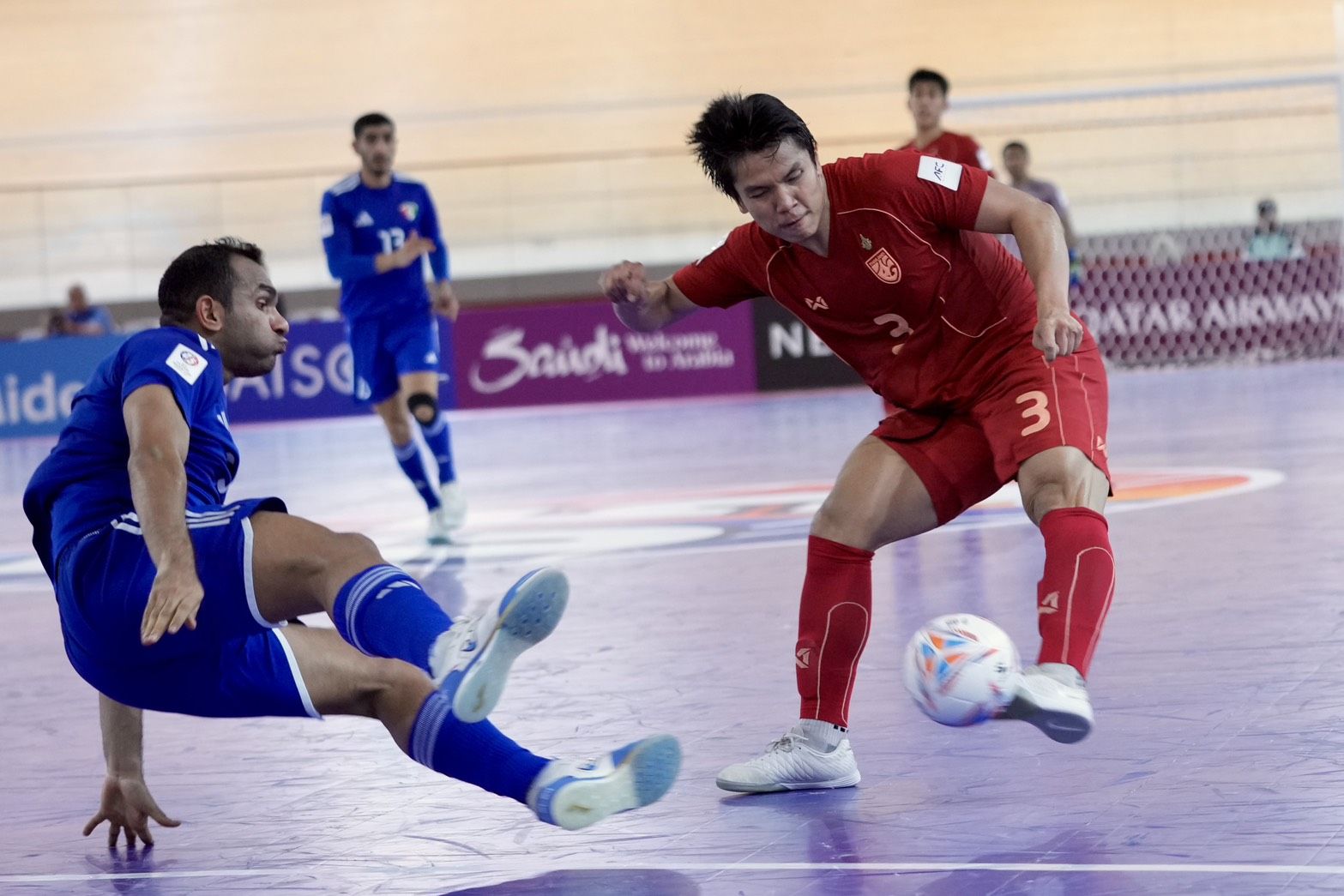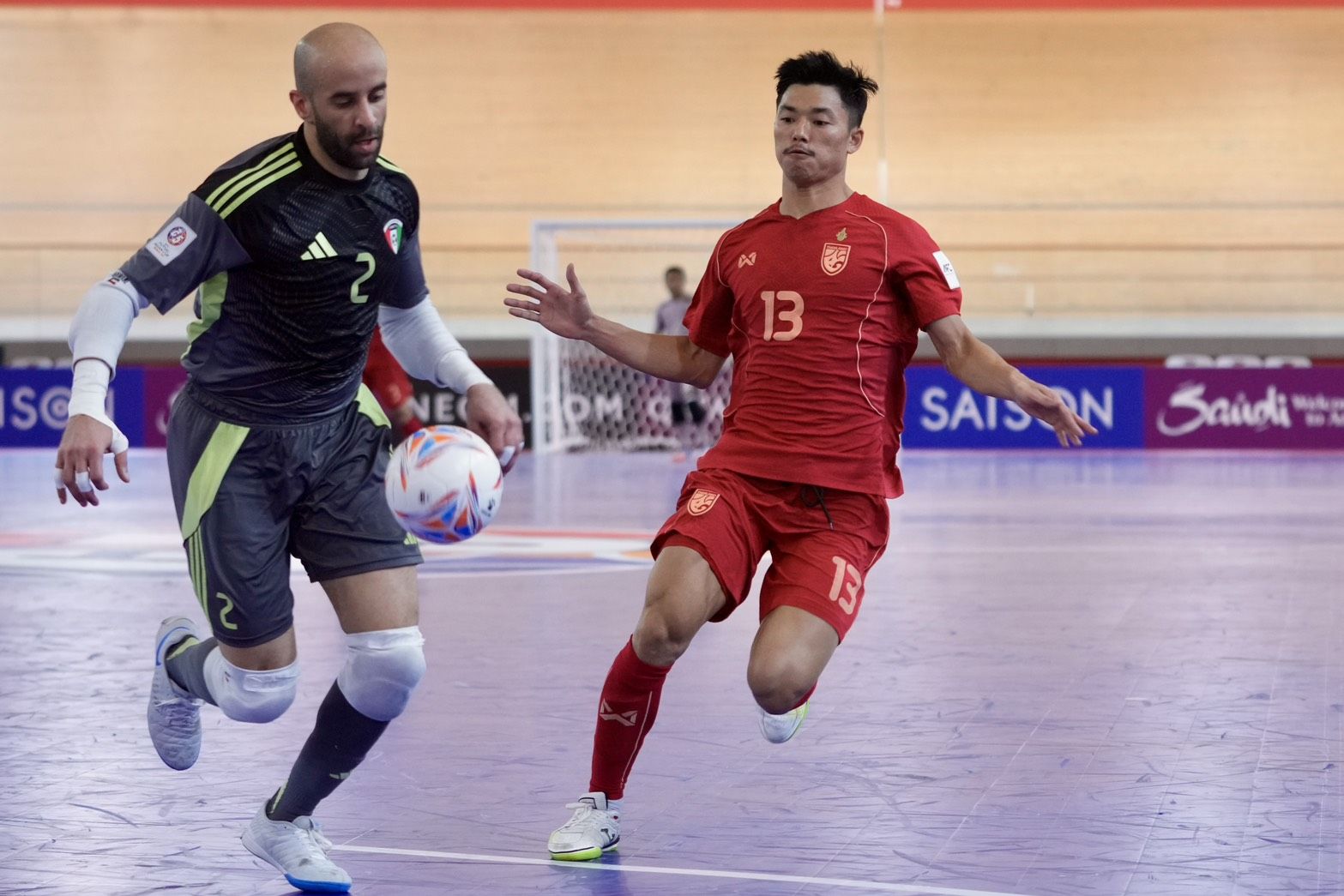 นาที 13 ไทยมาได้ลุ้นจากจังหวะที่ ปาณัสม์ กิตติภานุวงศ์ ทำชิ่งกับ มูฮัมหมัด อุสมานมูซา ก่อนยิงด้วยขวาแต่ยังไปติดเซฟของ ฟาฮัด อัลคาวารี