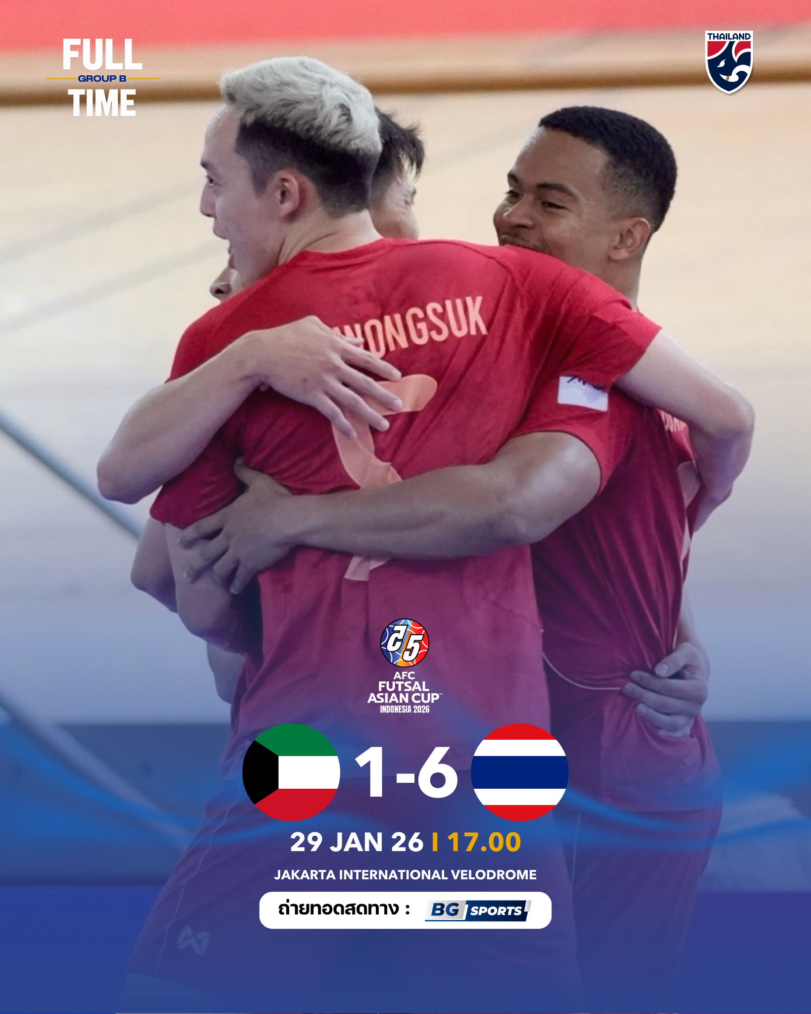 วันที่ 29 มกราคม 2569 เวลา 17.00 น. ณ จาการ์ตา อินเตอร์เนชั่นแนล เวโลโดรม ประเทศอินโดนีเซีย การแข่งขันฟุตซอลชิงแชมป์เอเชีย 2026 รอบแบ่งกลุ่ม กลุ่มบี นัดที่สอง ฟุตซอลชายทีมชาติไทย ลงสนามพบกับ คูเวต