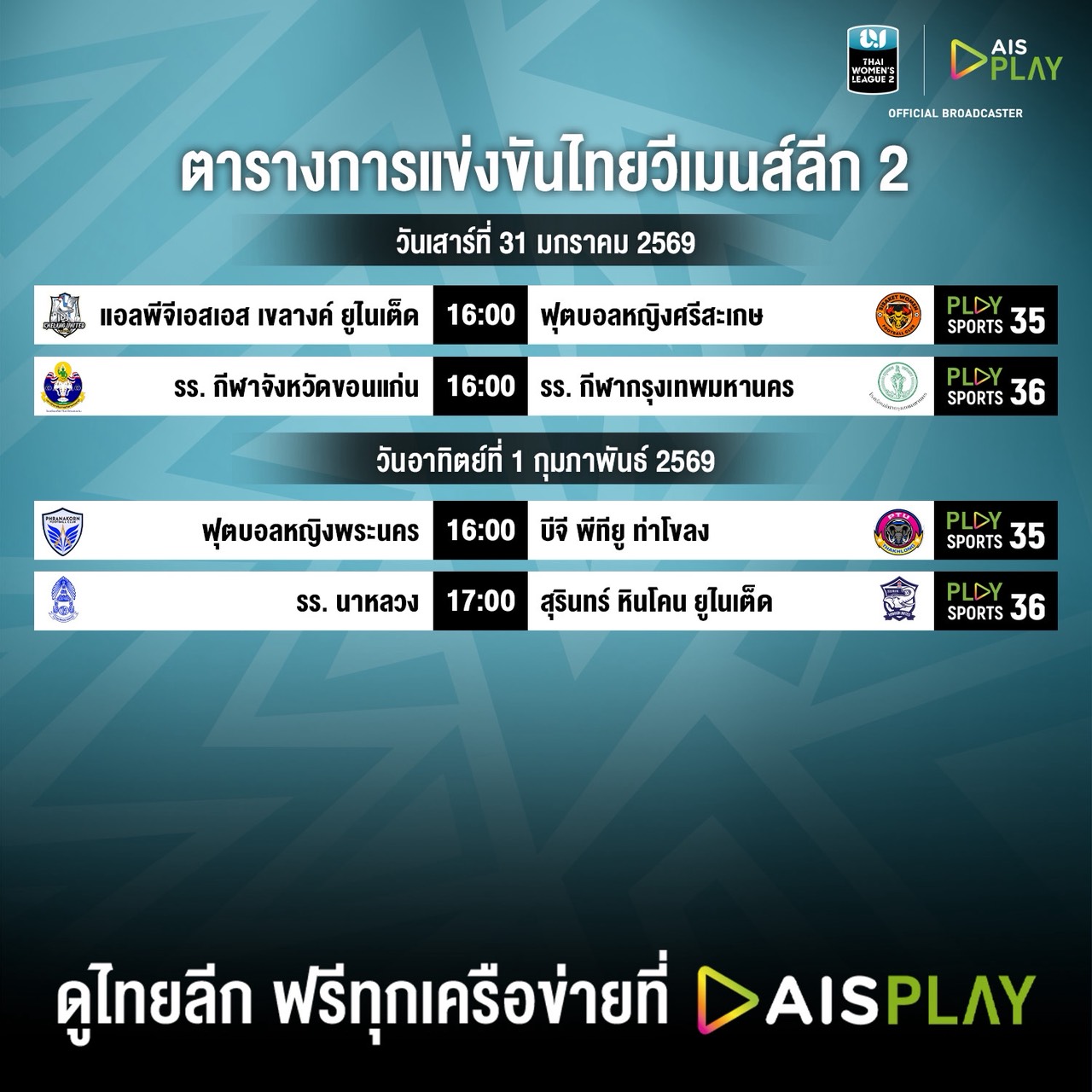 ร่วมลุ้นและส่งแรงใจเชียร์นัดเปิดสนามผ่านหน้าจอ AIS PLAY ในวันเสาร์ที่ 31 มกราคม 2569 เวลา 16.00 น. ระหว่าง โรงเรียนกีฬาจังหวัดชลบุรี พบ กรุงเทพมหานคร และ โรงเรียนกีฬาจังหวัดนครศรีธรรมราช พบ มหาวิทยาลัยเกษมบัณฑิต เอฟซี ซึ่งแฟนบอลสามารถชมความตื่นเต้นทั้งหมดได้ผ่านทุกช่องทางของ AIS PLAY