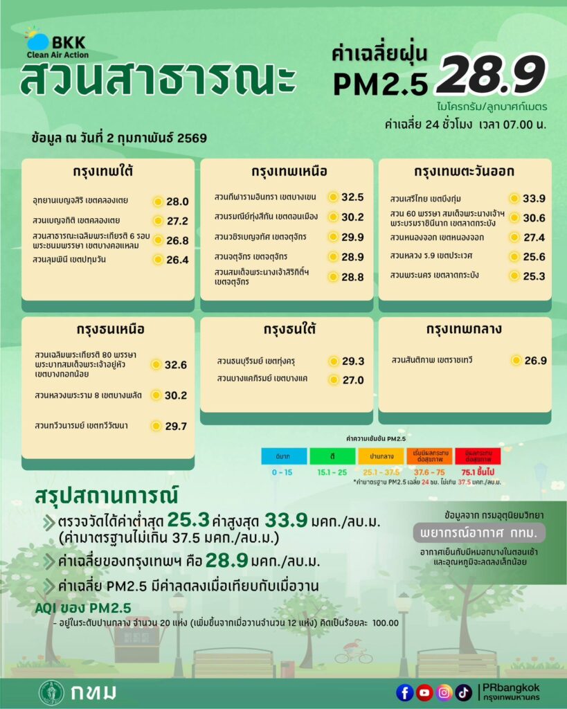 ศูนย์ข้อมูลคุณภาพอากาศกรุงเทพมหานคร ขอรายงานสถานการณ์ฝุ่นละอองขนาดไม่เกิน 2.5 ไมครอน (PM 2.5) ในกรุงเทพมหานคร ประจำวันที่ 2 กุมภาพันธ์ 2569 เวลา 07:00 น. ค่าเฉลี่ยของกรุงเทพมหานคร 34.9 ไมโครกรัมต่อลูกบาศก์เมตร (มคก./ลบ.ม.) (ค่ามาตรฐานไม่เกิน 37.5 มคก./ลบ.ม.)