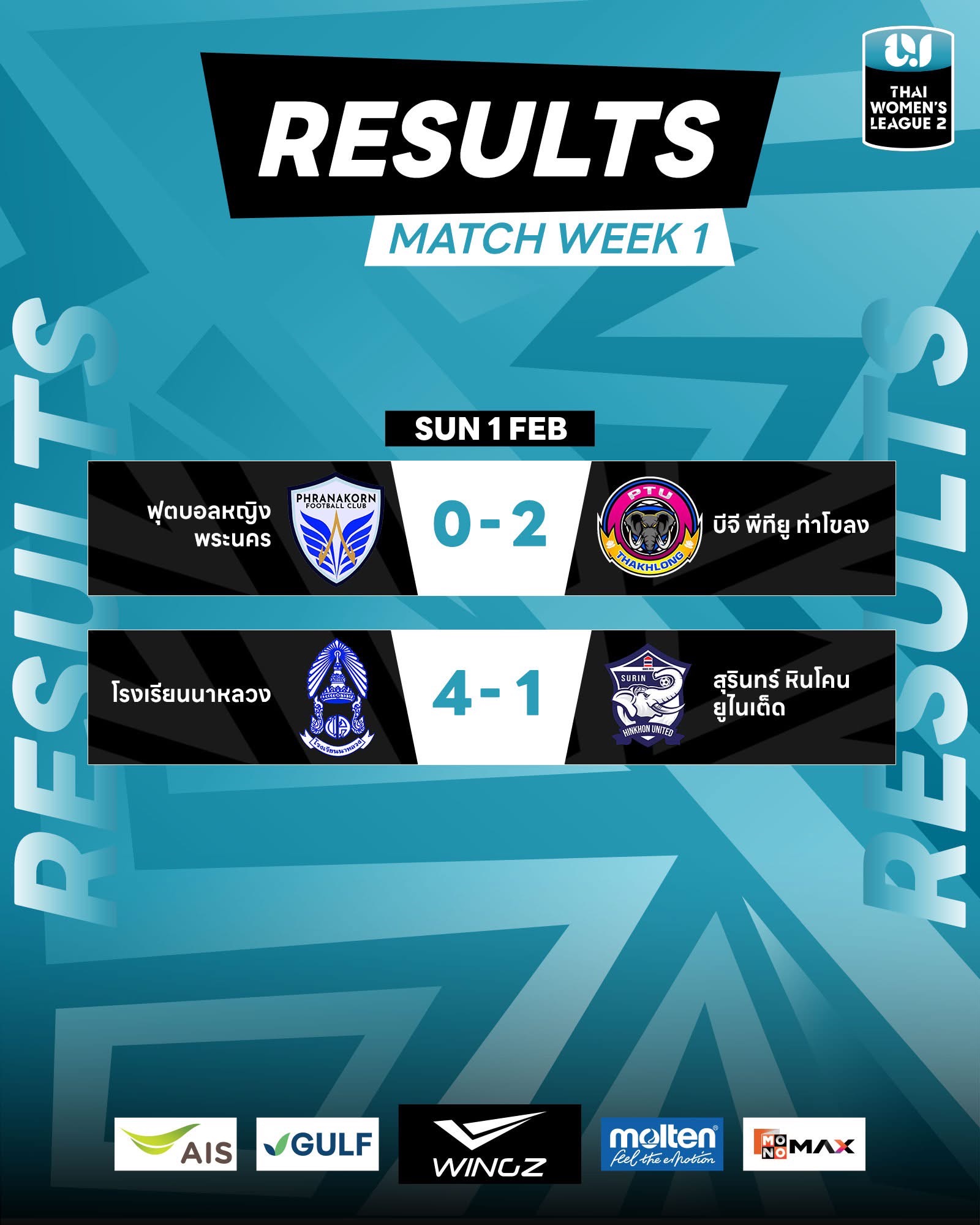 ขณะที่ผลฟุตบอลไทยวีเมนส์ลีก 2 ฤดูกาล 2026 แมตช์เดย์ที่ 1 ประจำวันอาทิตย์ที่ 1 กุมภาพันธ์ 2569