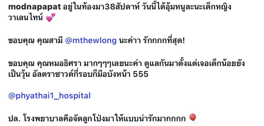 โดยสาว “มด ณปภัช” ได้ออกมาโพสต์รูปข้อความว่า “อยู่ในท้องมา 38 สัปดาห์ วันนี้ได้อุ้มหนูละนะ เด็กหญิงวาเลนไทน์ 💕ขอบคุณ คุณสามี @mthewlong นะค่าา รักที่สุด! ขอบคุณ คุณหมอธิศรา มากๆๆๆ เลยนะค่า ดูแลกันมาตั้งแต่เจอเด็กน้อยยังเป็นวุ้น อัลตราซาวด์กี่รอบก็มือบังหน้า 555 @phyathai1_hospital ปล.โรงพยาบาลคือจัดลูกโป่งมาให้แบบน่ารักมากกกก 🎈” ท่ามกลางโมเมนต์ชาวเน็ต และเพื่อนในวงการบันเทิง ต่างเข้ามาคอมเมนต์แสดงความยินดีกันอย่างล้นหลามพร้อมคอมเมนต์ว่าน้องน่ารักน่าชังมาก