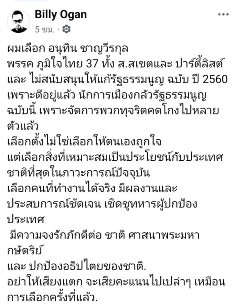 ล่าสุดทำเอาโซเชียลกระหึ่ม เมื่อทางด้าน ศิลปินเพลงร็อกเกอร์รุ่นใหญ่ “บิลลี่ โอแกน” ได้ออกมาประกาศจุดยืนชัดเจนในการเลือกตั้งครั้งนี้ โดยโพสต์ภาพตัวเองพร้อมข้อความว่า “ผมเลือก อนุทิน ชาญวีรกุล พรรค ภูมิใจไทย 37 ทั้ง ส.สเขตและ ปาร์ตี้ลิสต์ และ ไม่สนับสนุนให้แก้รัฐธรรมนูญ ฉบับ ปี 2560 เพราะดีอยู่แล้ว นักการเมืองกลัวรัฐธรรมนูญฉบับนี้ เพราะจัดการพวกทุจริตคดโกงไปหลายตัวแล้ว เลือกตั้งไม่ใช่เลือกให้ตนเองถูกใจ