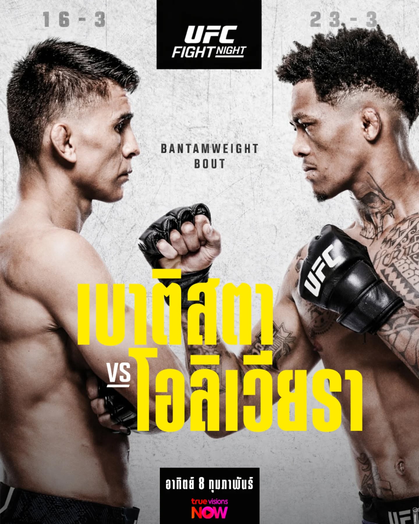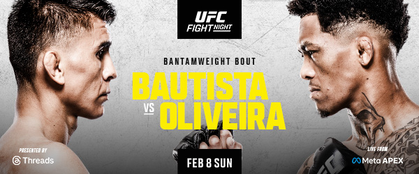 สำหรับการต่อสู้ภายใต้รายการ UFC FIGHT NIGHT : BAUTISTA VS OLIVEIRA จะระเบิดศึก ณ สังเวียน Meta APEX, ลาส เวกัส ,สหรัฐอเมริกา วันอาทิตย์ที่ 8 กุมภาพันธ์ นี้ คู่หลักของรายการเริ่มเวลา 08.00 น. ตามเวลาประเทศไทย