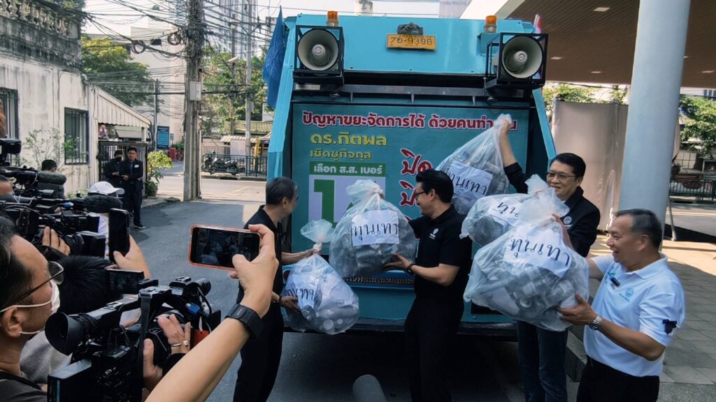 จากนั้น นายอภิสิทธิ์ และคณะ ได้ขึ้นสาธิตการใช้งานรถกำจัดขยะระบบปิด พร้อมถือกาบัตรสีฟ้า 2 ใบ รณรงค์เลือกพรรคประชาธิปัตย์ และร่วมกันโยนถุง “ขยะทุนเทา” ลงในรถ เพื่อสื่อสารเชิงสัญลักษณ์ถึงการจัดการปัญหาอย่างโปร่งใสและยั่งยืน