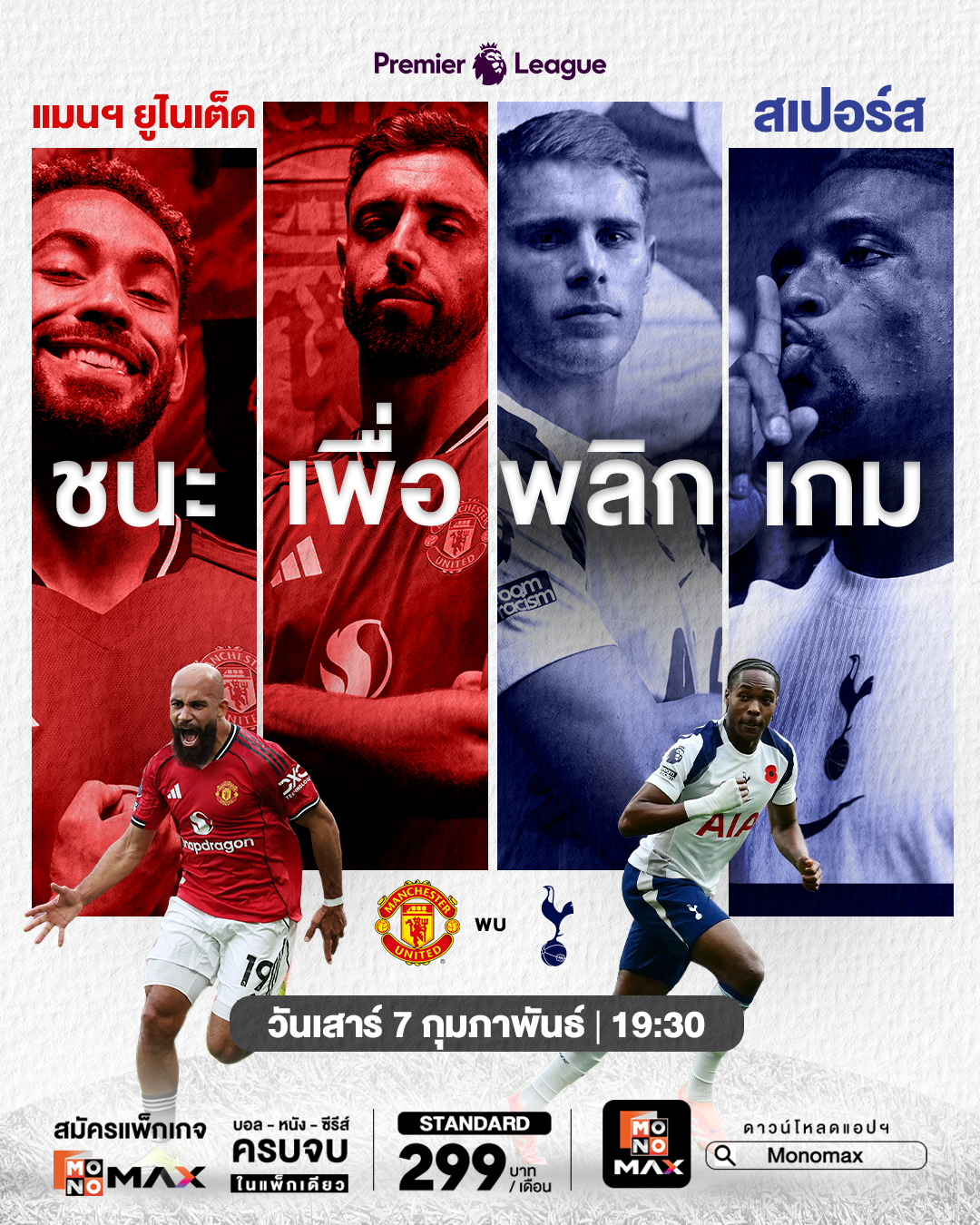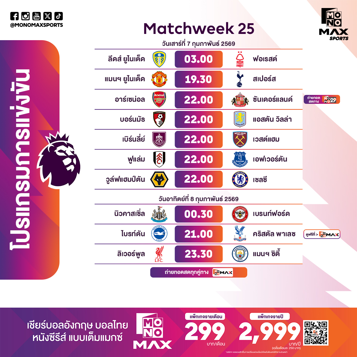 เตรียมพบกับความมันแบบต่อเนื่องตลอดสุดสัปดาห์ เมื่อศึกฟุตบอลพรีเมียร์ลีก อังกฤษ เดินหน้าเข้าสู่ช่วงสำคัญของฤดูกาล เมื่อเกมลุ้นแชมป์ เกมแย่งท็อปโฟร์ และศึกหนีตกชั้นโคจรมาชนกันแบบไม่มีพัก ในคืน วันเสาร์ที่ 7 กุมภาพันธ์ 2569 และวันอาทิตย์ที่ 8 กุมภาพันธ์ 2569 โดย Monomax จัดเต็มถ่ายทอดสดทุกคู่ และบางคู่รับชมได้ทาง ช่อง MONO29 ให้แฟนบอลไทยได้สัมผัสเกมคุณภาพระดับโลกแบบจุใจ