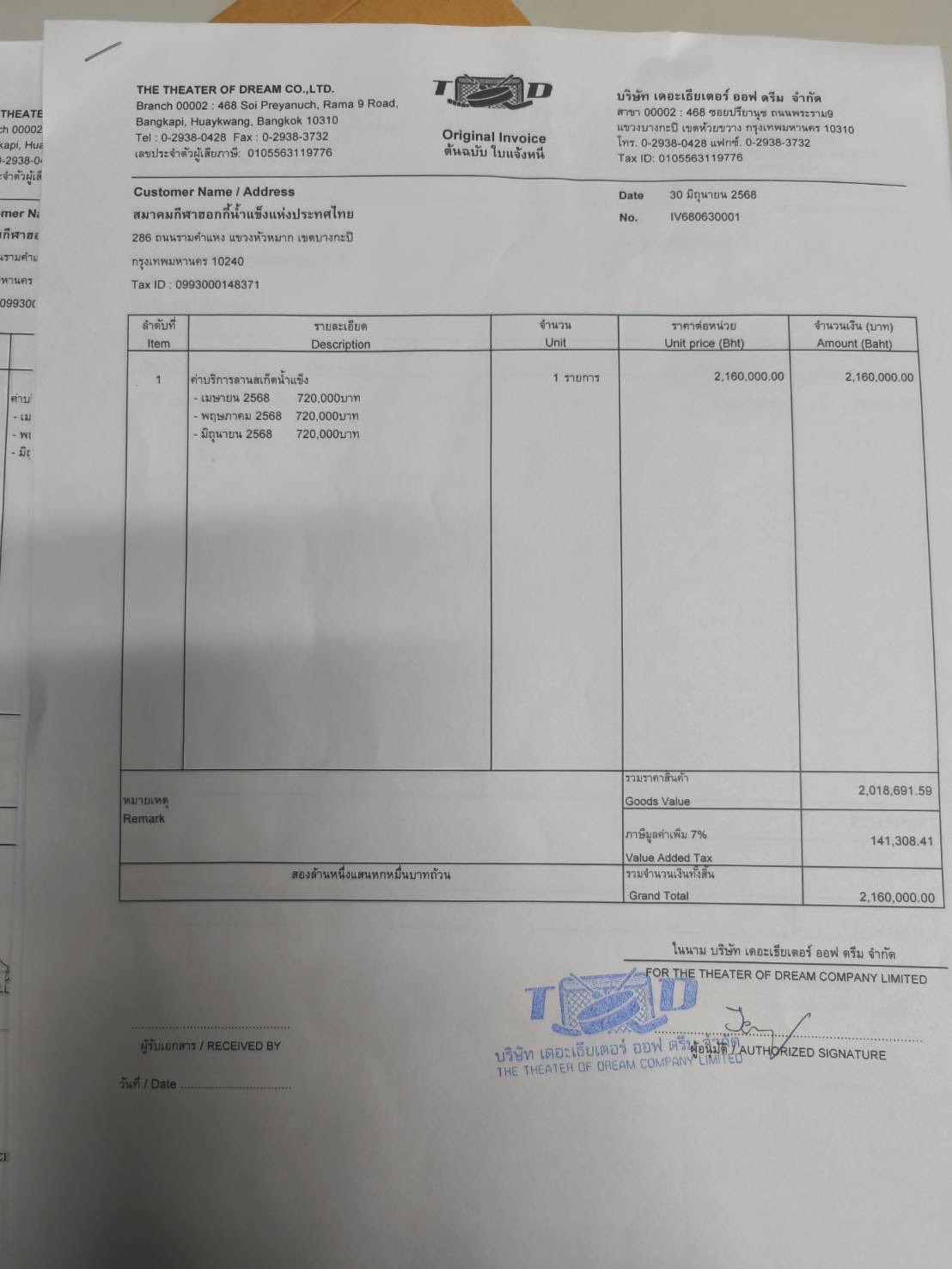 ด้านสมาคมกีฬาฮอกกี้น้ำแข็งแห่งประเทศไทย ได้ออกมาเปิดเอกสารแจ้งหนี้เพื่อตอบโต้ข้อกล่าวหา โดยเอกสารดังกล่าวระบุยอดค่าเช่าสนามเดือนละ 720,000 บาท ในช่วงเดือนเมษายน พฤษภาคม และมิถุนายน พร้อมลายเซ็นและตราประทับบริษัท เดอะเธียเตอร์ ออฟ ดรีม จำกัด ซึ่งเป็นนิติบุคคลเจ้าของลาน