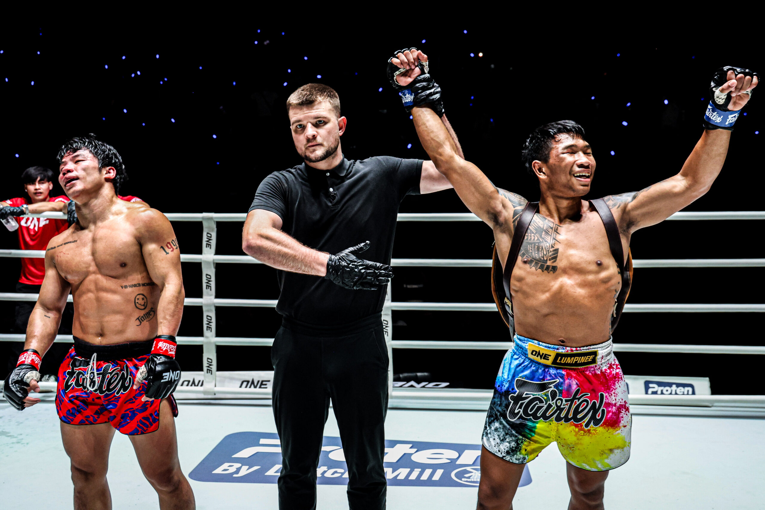 ไฟต์นี้เดือดถึงใจ “สมิงดำ เอ็นเอฟ.ลูกสวน” เบียดชนะแต้ม “คมอาวุธ เอฟเอ.กรุ๊ป” กวาดชัย 4 ไฟต์ติด ศึก ONE ลุมพินี 141