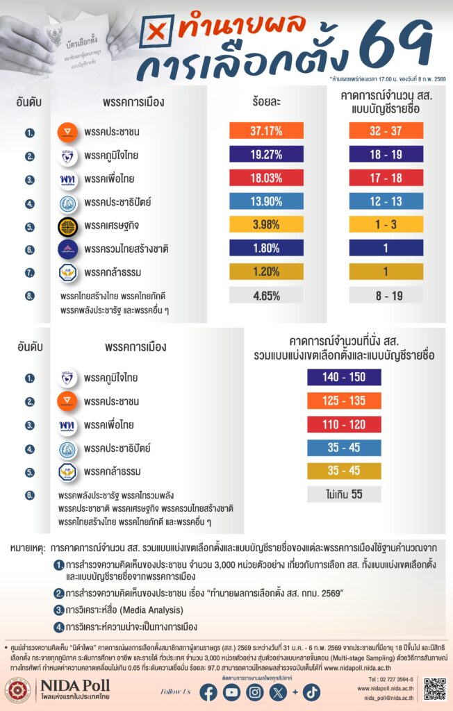 ศูนย์สำรวจความคิดเห็น “นิด้าโพล” สถาบันบัณฑิตพัฒนบริหารศาสตร์ (นิด้า) คาดการณ์ผลการเลือกตั้งสมาชิกสภาผู้แทนราษฎร (สส.) 2569 ประกอบด้วยวิธีการ คือ 1) เก็บข้อมูลด้วยวิธีการสัมภาษณ์ทางโทรศัพท์ โดยทำการสำรวจระหว่างวันที่ 31 มกราคม – 6 กุมภาพันธ์ 2569 จากประชาชนที่มีอายุ 18 ปีขึ้นไป และมีสิทธิเลือกตั้ง กระจายทุกภูมิภาค ระดับการศึกษา อาชีพ และรายได้ ทั่วประเทศ รวมจำนวนทั้งสิ้น 3,000 หน่วยตัวอย่าง