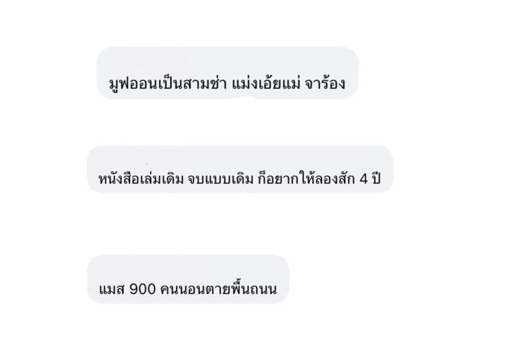 “มูฟออนเป็นสามช่า แม่งเอ้ยแม่ จาร้อง” , “แมส 900 คนนอนตายพื้นถนน” , “หนังสือเล่มเดิม จบแบบเดิม ก็อยากให้ลองสัก 4 ปี”