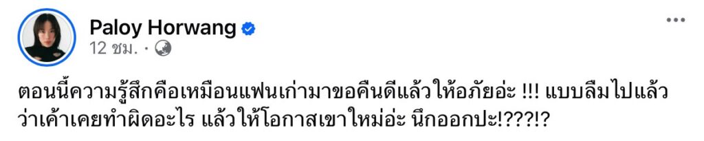 กลายเป็นโพสต์ที่ทำให้หลายคนหูผึ่ง เอ๊ะมันยังไง เมื่อนักแสดงสาว “พลอย หอวัง” ออกมาโพสต์ข้อความผ่านเฟซบุ๊กส่วนตัว สื่อถึงความรู้สึกในลักษณะเปรียบเปรยถึงการยอมใจอ่อน เปิดโอกาสให้แฟนเก่ากลับเข้ามาในชีวิตอีกครั้ง งานนี้ทำเอาชาวเน็ตต่างจับตา พร้อมตั้งคำถามถึงความหมายที่แท้จริงของข้อความดังกล่าว ว่าจะเกี่ยวข้องกับเรื่องราวความรักในชีวิตจริงของเจ้าตัวหรือไม่ หรือว่าหมายถึงอะไรนะ