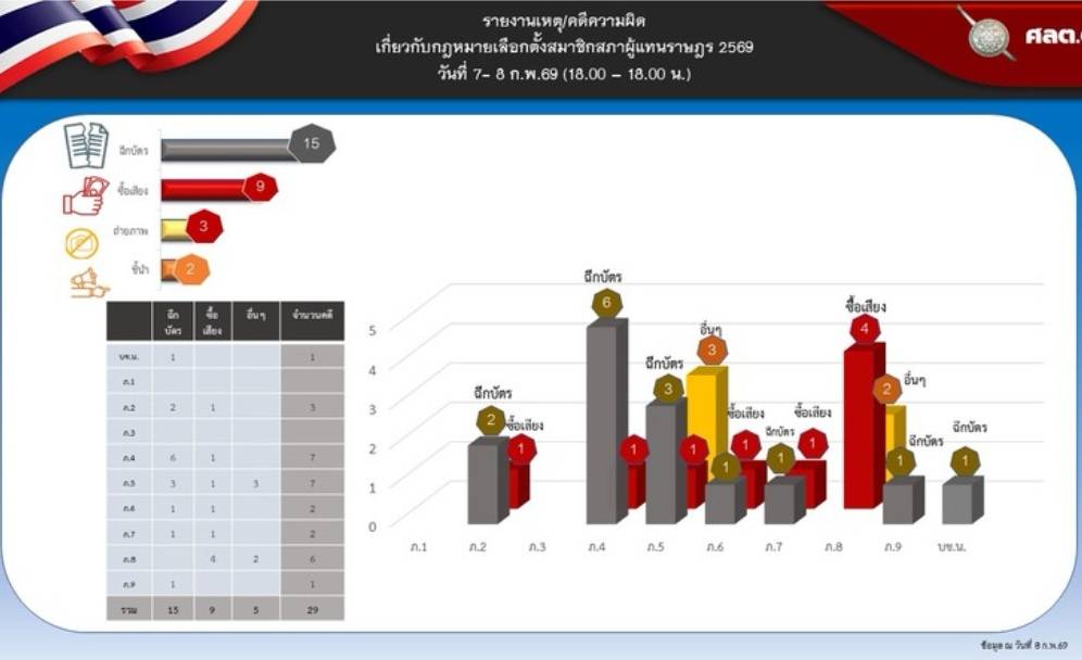 ทั้งนี้ รายงานเหตุคดีความผิดเกี่ยวกับกฎหมายเลือกตั้งสมาชิกสภาผู้แทนราษฎร 2569 ตั้งแต่วันที่ 7-8 กุมภาพันธ์ 2569 เวลา18.00 น. พบมีการฉีกบัตร 15 คดี พื้นที่ กองบัญชาการตำรวจภูธรภาค 4 เยอะสุดจำนวน 6คดี, กองบัญชาการตำรวจภูธรภาค 5 จำนวน 3 คดี, กองบัญชาการตำรวจภูธรภาค2 จำนวน 2 คดี และกองบัญชาการตำรวจ ทำ นครบาล, กองบัญชาการตำรวจภูธรภาค6, กองบัญชาการตำรวจภูธร ภาค7 และกองบัญชาการตำรวจภูธรภาค9 อย่างละ 1 คดี