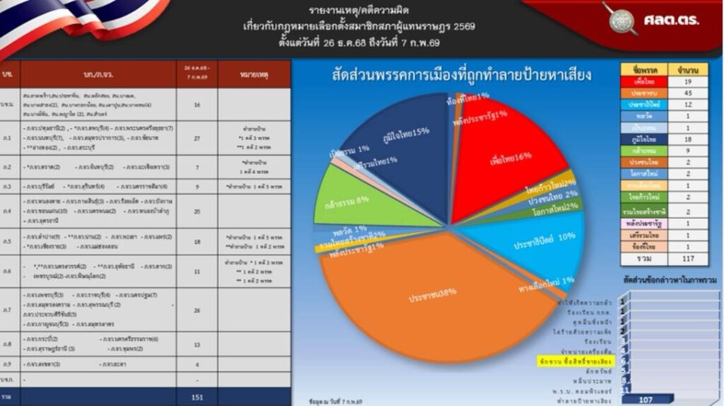 วันนี้ (9 ก.พ.69) ศูนย์อำนวยการรักษาความปลอดภัยและความสงบเรียบร้อยการจัดการเลือกตั้ง สำนักงานตำรวจแห่งชาติ หรือ ศลต.ตร. เปิดสถิติคดีเกี่ยวกับการเลือกตั้งสมาชิกสภาผู้แทนราษฎร 2569 ตั้งแต่วันที่ 26 ธันวาคม 2568 ถึงปัจจุบัน พบมีการกระทำความผิดในหลายข้อหาทั้งทำลายป้ายหาเสียงทำให้เกิดความกลัวสอง,ร้องเรียน กกต.ดูหมิ่นซึ่งหน้า ,ใส่ร้ายด้วยความเท็จ,ร้องเรียน, จำหน่ายเครื่องดื่ม , รวมทั้ง ชักชวนซื้อสิทธิ์ขายเสียง ลักทรัพย์หมิ่นประมาท พ.ร.บ.คอมพิวเตอร์ ฯ รวมทั้งหมด 151 คดี