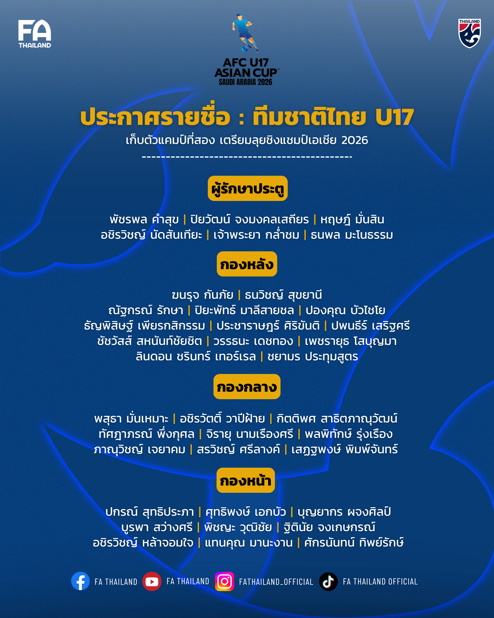สมาคมกีฬาฟุตบอลแห่งประเทศไทย ในพระบรมราชูปถัมภ์ ประกาศรายชื่อ 37 นักฟุตบอลชายทีมชาติไทย รุ่นอายุไม่เกิน 17 ปี เก็บตัวฝึกซ้อมแคมป์ที่สอง เพื่อเตรียมความพร้อมสำหรับทำการแข่งขันฟุตบอลชิงแชมป์เอเชีย รุ่นอายุไม่เกิน 17 ปี 2026 รอบสุดท้าย (AFC U17 Asian Cup Saudi Arabia 2026) ระหว่างวันที่ 5 – 22 พฤษภาคม 2569 ณ ประเทศซาอุดีอาระเบีย ภายใต้การคุมทัพของ “มาร์โค ก็อคเคิ่ล” หัวหน้าผู้ฝึกสอน