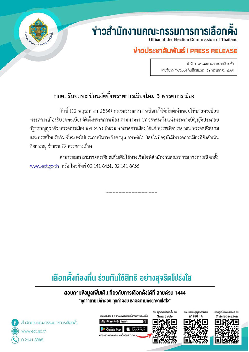 สำนักงานคณะกรรมการการเลือกตั้ง(กกต.) เผยแพร่เอกสาร คณะกรรมการการเลือกตั้งได้มีมติเห็นชอบให้นายทะเบียนพรรคการเมืองรับจดทะเบียนจัดตั้งพรรคการเมือง ตามมาตรา 17 วรรคหนึ่ง แห่งพระราชบัญญัติประกอบรัฐธรรมนูญว่าด้วยพรรคการเมือง พ.ศ. 2560 จำนวน 3 พรรคการเมือง ได้แก่ พรรคเพื่อประชาชน พรรคพลังสยามและพรรคไทยรักกัน ซึ่งจะส่งไปประกาศในราชกิจจานเบกษาต่อไป โดยในปัจจุบันมีพรรคการเมืองที่ยังดำเนินกิจการอยู่ จำนวน 79 พรรคการเมือง