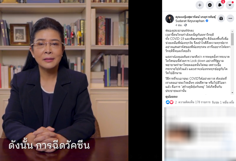 ตัวดิฉันเองรู้สึกไม่ต่างจากพี่น้องทุกท่านดิฉันโกรธกับความล้มเหลว และความไร้ประสิทธิภาพของรัฐบาล ที่จัดหาวัคซีนล่าช้า ไม่เพียงพอ ไม่มีตัวเลือก และประสิทธิภาพวัคซีนอาจไม่ทัดเทียมกับของประเทศอื่น แต่วันนี้เราต้องทำให้คนไทนทุกคนรอดก่อน ดิฉันขอเรียนว่าข้อมูลทางการแพทย์จากทุกสถาบันยืนยันว่า ถึงแม้วัคซีนจะมีประสิทธิภาพต่างกันบ้าง แต่ “วัคซีน” COVID-19 ที่ผ่านการรับรองทุกชนิด สามารถลดความรุนแรง ลดการป่วยหนัก และลดการเสียชีวิตจาก COVID-19 ได้