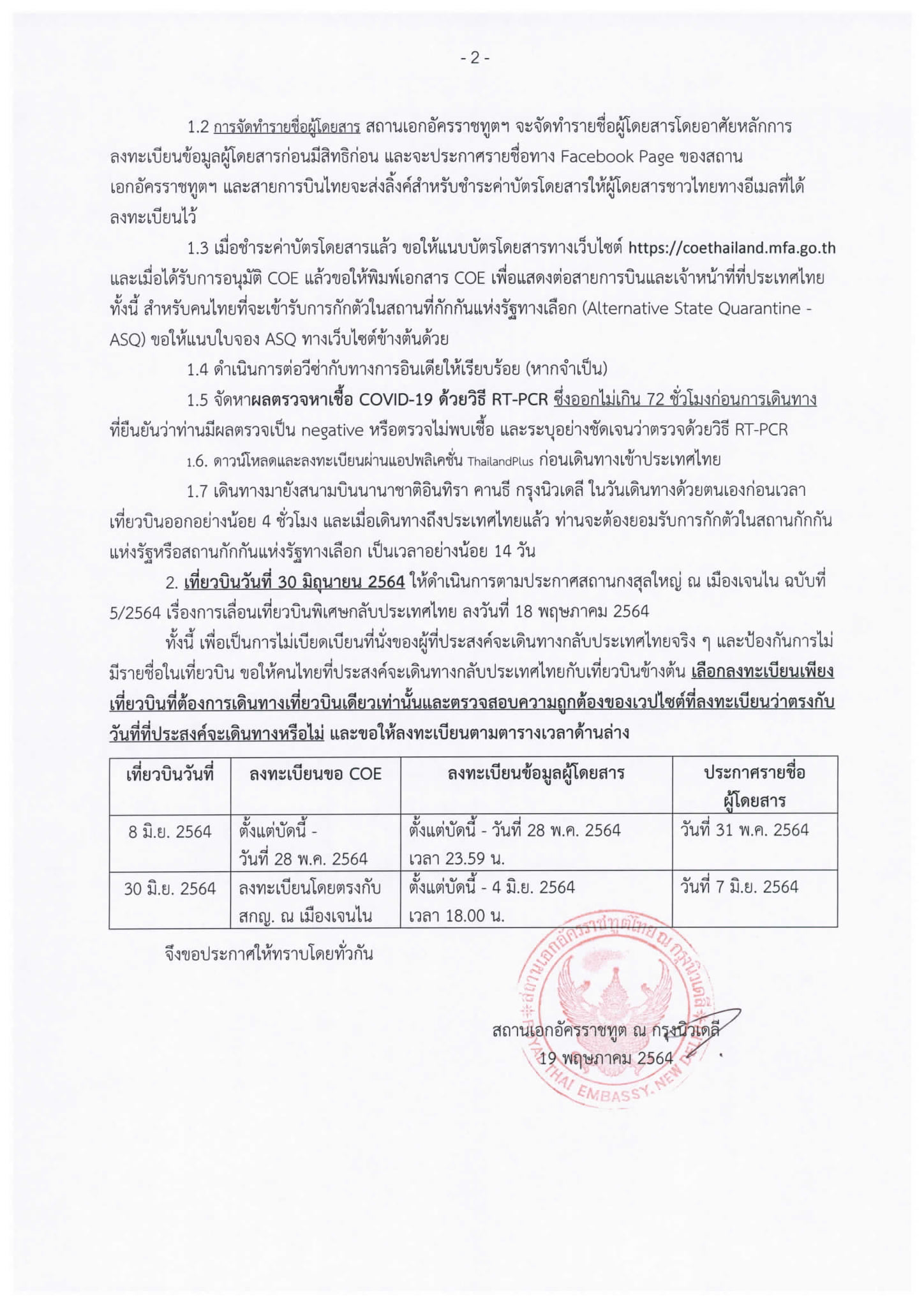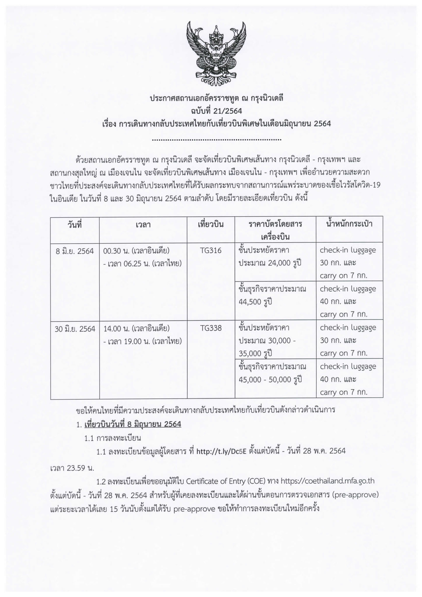 สถานเอกอัครราชทูตไทย กรุงนิวเดลี ประเทศ อินเดีย ออกประกาศการเดินทางกลับประเทศไทย เที่ยวบินพิเศษ เดือนมิถุนายน 2564 เส้นทาง กรุงนิวเดลี-กรุงเทพฯ และเมืองเจนใน-กรุงเทพฯ เพื่ออำนวยความสะดวก ประชาชนไทยในอินเดีย ที่ไดรับผลกระทบจากสถานการณ์การแพร่ระบาด COVID-19 ในอินเดีย และประสงค์จะเดินทางกลับประเทศไทย ในวันที่ 8 และ 30 มิถุนายนนี้ เบื้องต้น 2 เที่ยวบิน โดยเที่ยวบินในวันที่ 8 มิถุนายน จะเดินทางออกจากอินเดียเวลา 00.30 น. ถึงประเทศไทยเวลา 06.25 น. มีค่าใช้จ่ายสำหรับชั้นประหยัด ราคา 24,000 รูปี หรือประมาณ 10,000 บาท และ 44,500 รูปี หรือประมาณ 19,000 บาท